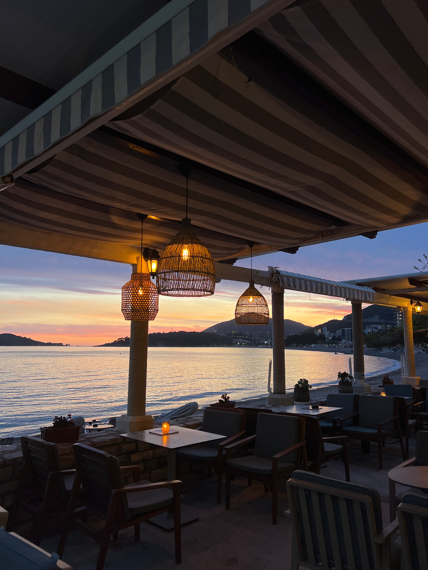 This image depicts an outdoor dining area in Budva, Montenegro, at dusk. The scene is partially under a striped awning. Wicker lamps hang from the awning, casting a warm glow. In the background, the s…read more