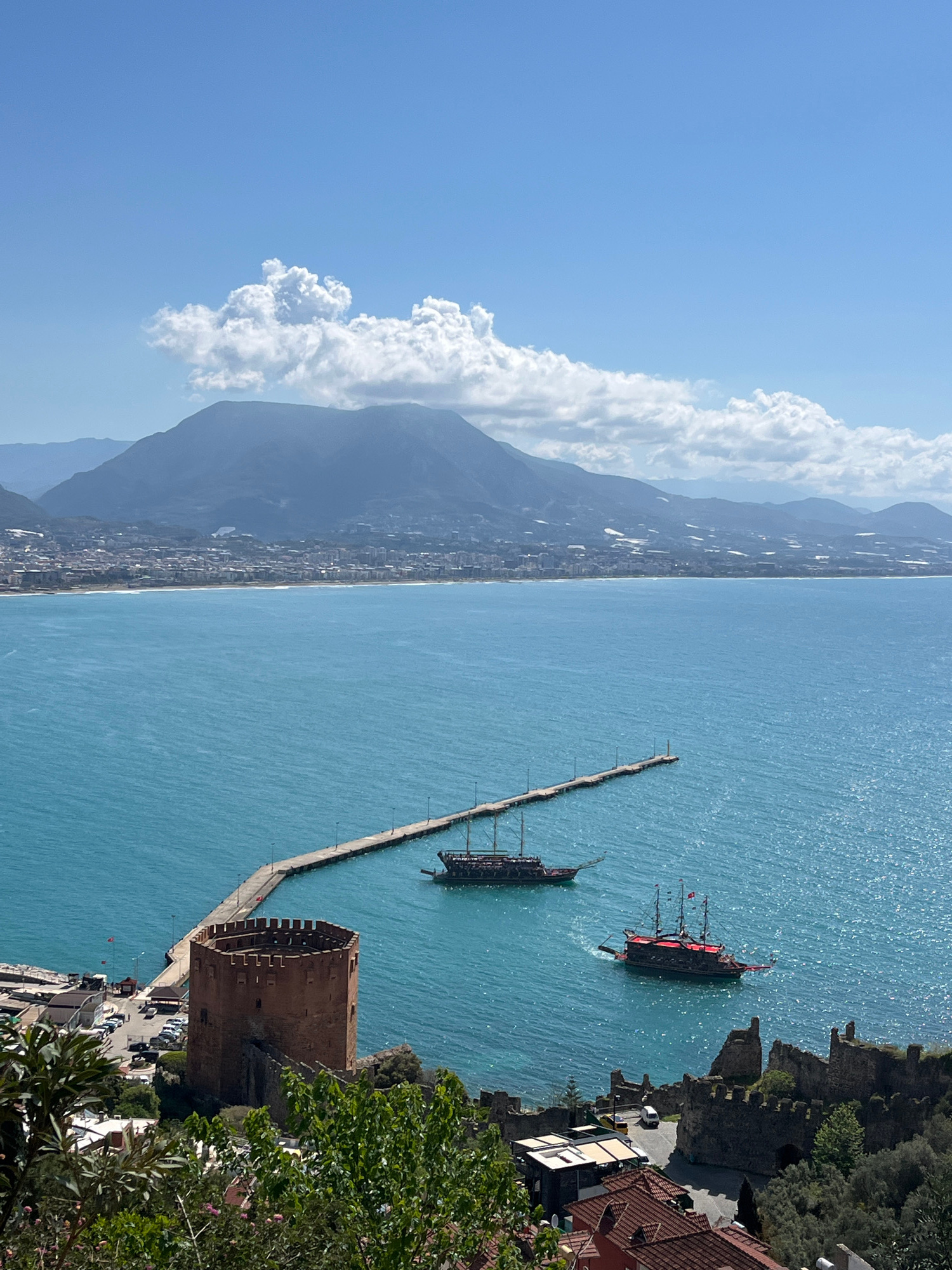 The image captures a view of the city of Alanya in Turkey, likely from an elevated position. The Mediterranean Sea dominates the right side of the frame, featuring two pirate ship replicas, one closer…read more