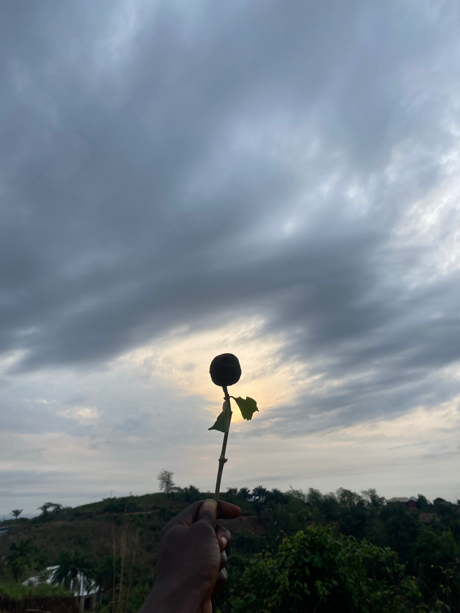 The image, oriented correctly, displays a person's hand holding a small plant against a backdrop of a cloudy sky and a distant natural landscape. A dark-skinned hand is visible on the right side of thβ¦read more
