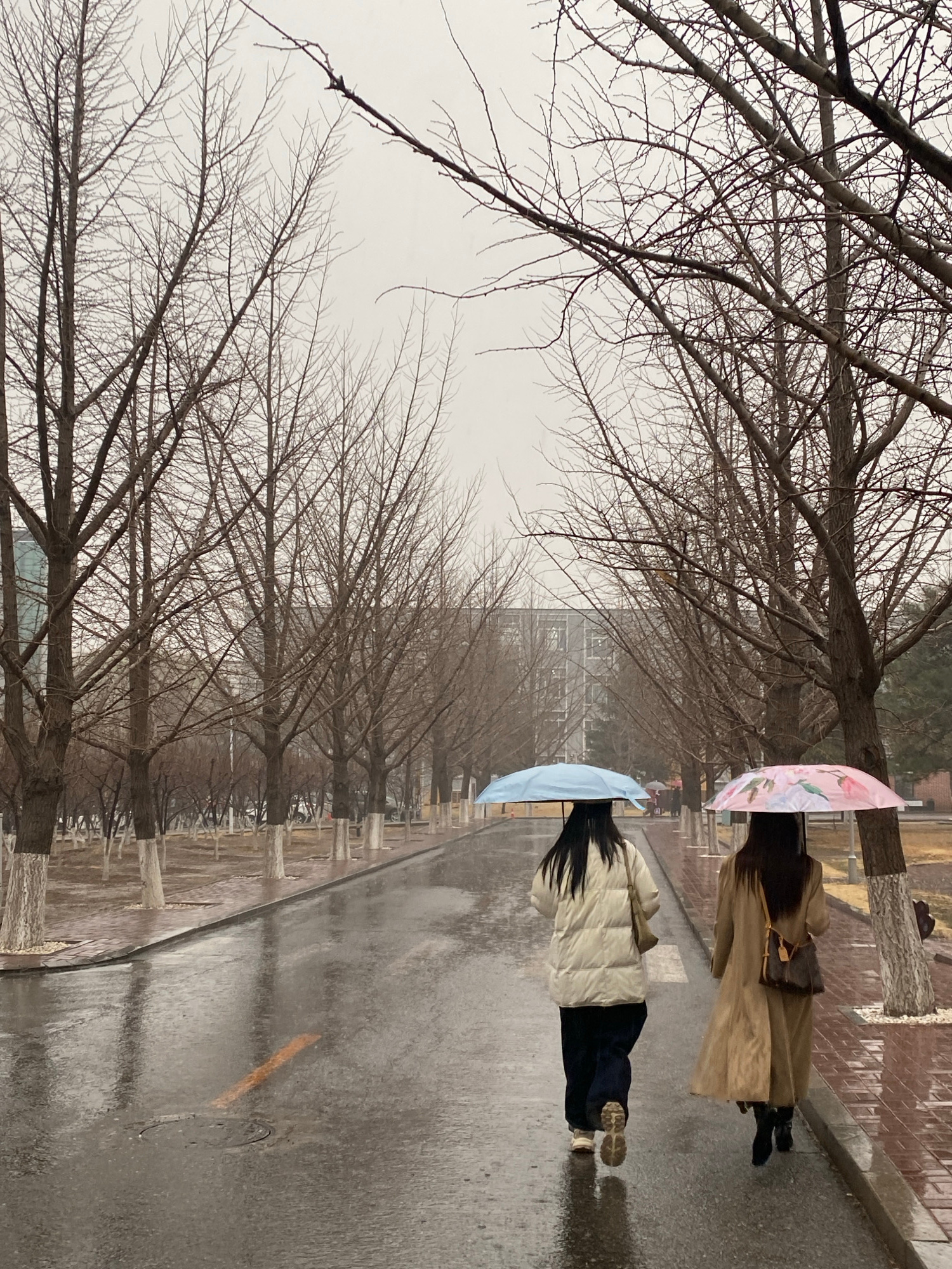 The image shows a street scene in Zhongtun, China on a rainy day. Two people are walking away from the camera. The first person is wearing a light-colored, quilted jacket and dark pants, and carrying…read more