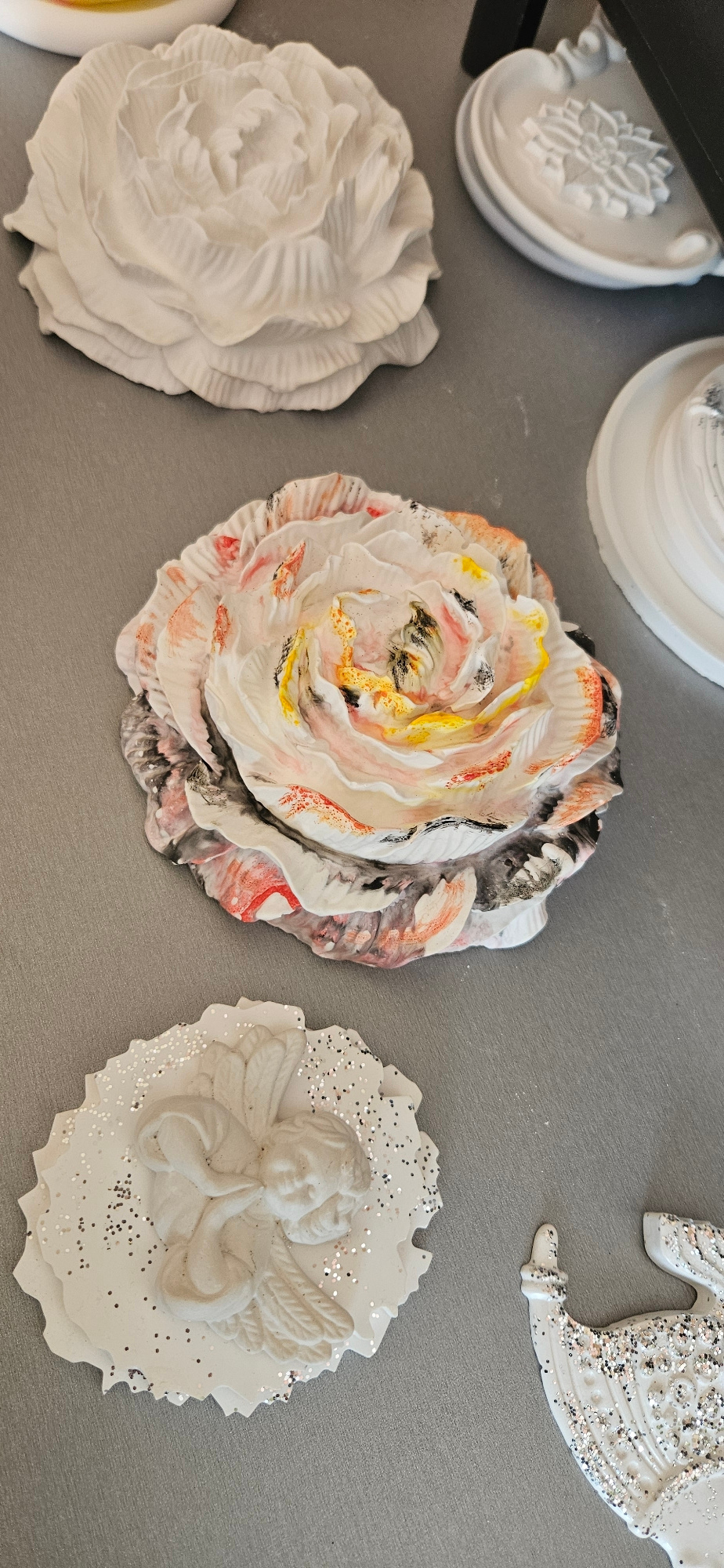 The image shows several decorative plaster ornaments on a gray surface. In the upper left corner is a fragment of a white plaster ornament with a floral design, possibly a ceiling medallion or furnitu…read more
