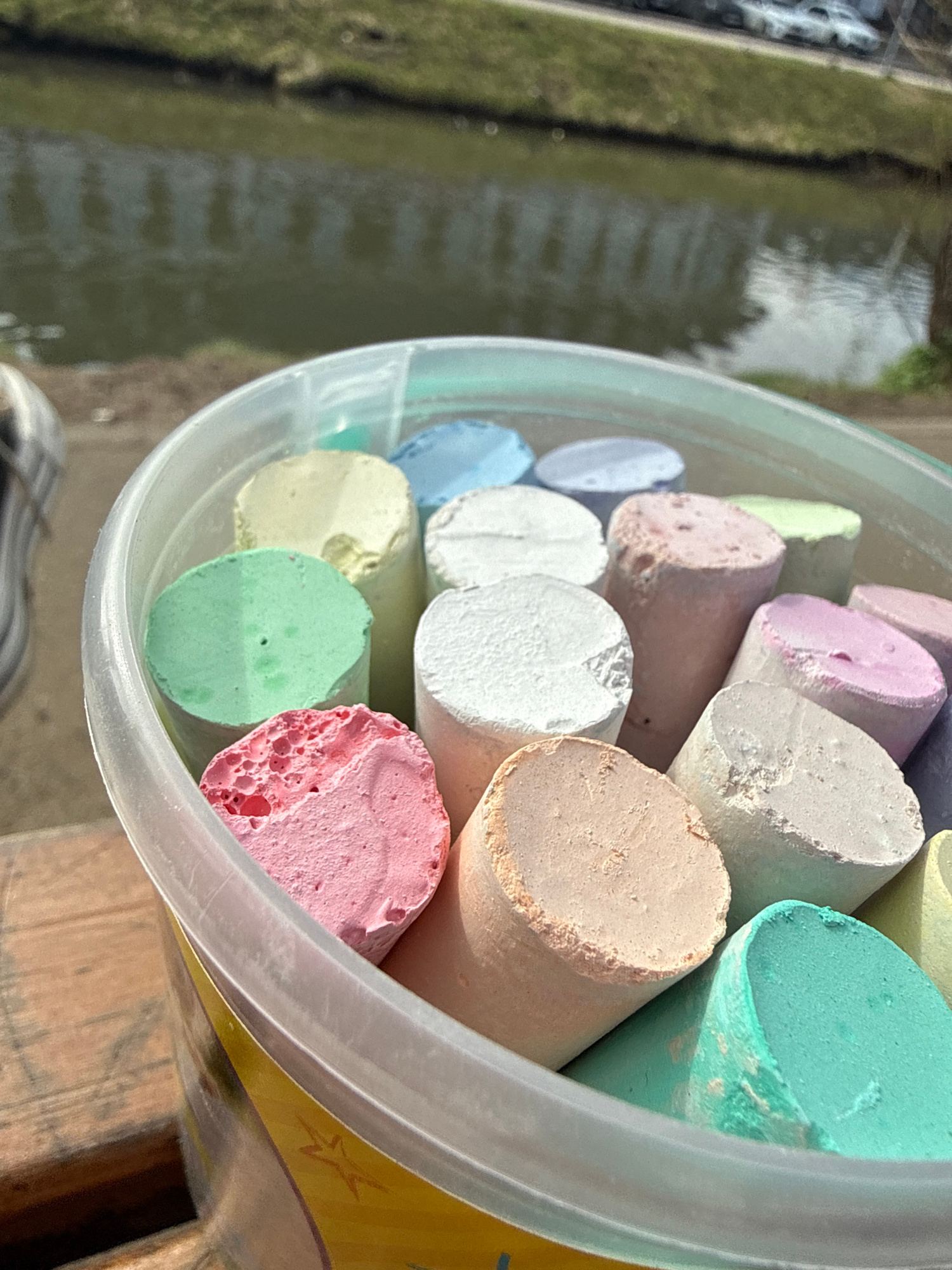 The image shows a clear plastic bucket filled with pieces of colorful sidewalk chalk. The chalk is in cylindrical shapes and includes colors like pink, white, blue, green, yellow, and lavender. The bu…read more