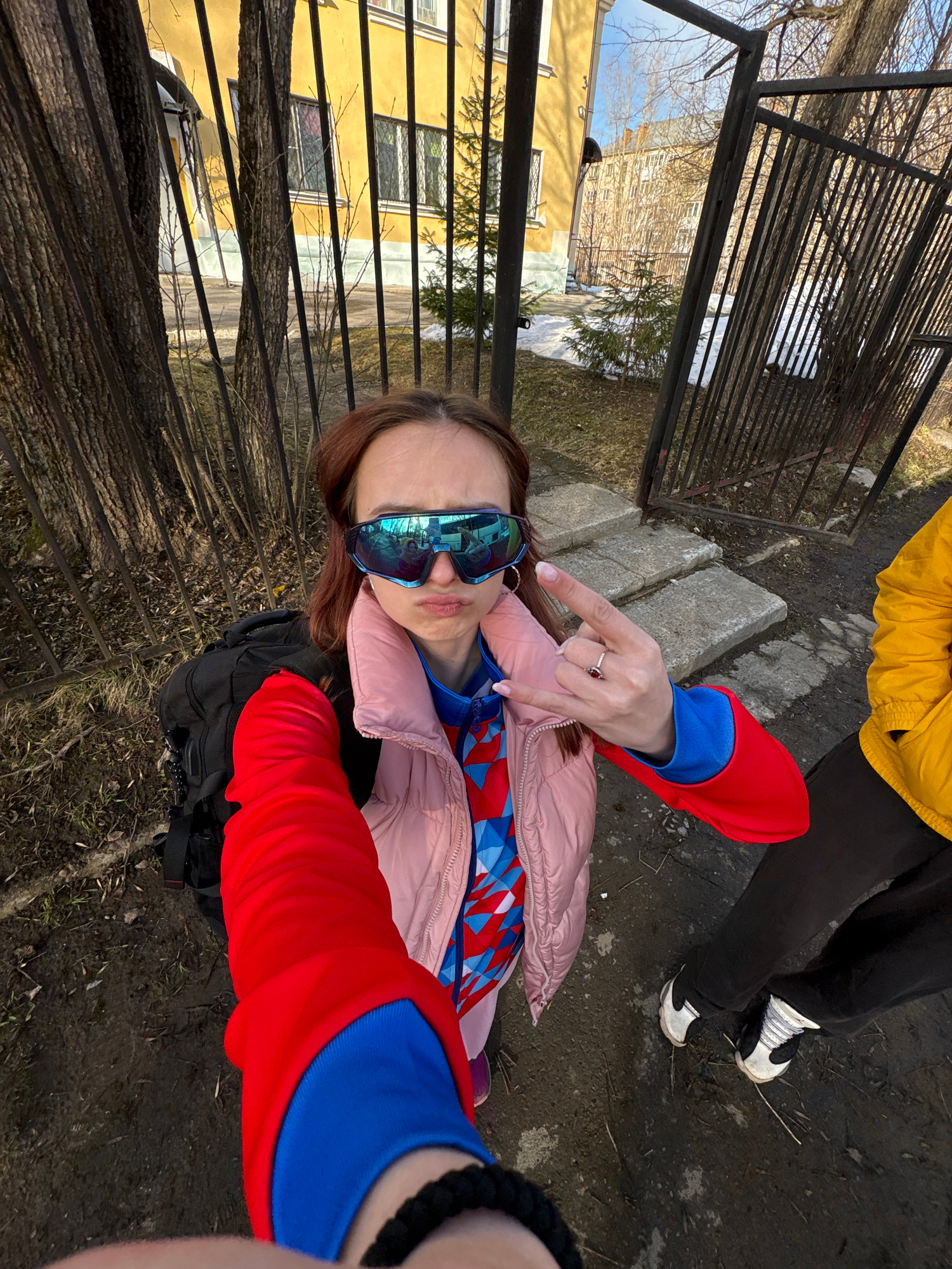 A woman wearing sunglasses, a red and blue jacket, and a pink puffer jacket poses for a selfie. She is wearing a ring on her left hand and makes a peace sign. She appears to be on the street near a me…read more