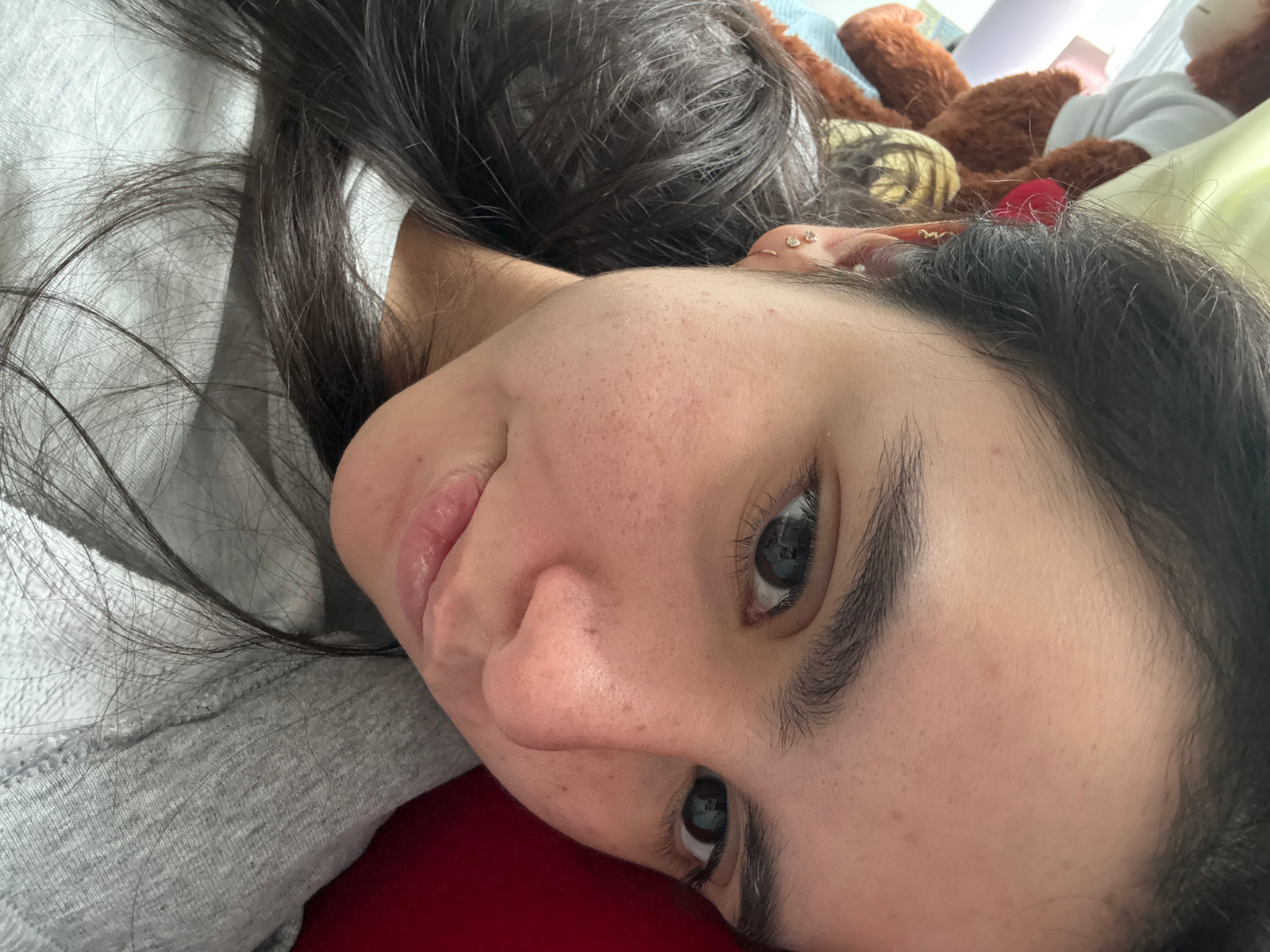 The image shows a close-up, angled view of a person's face. The person has dark hair, brown eyes, and appears to be wearing a grey top. The background includes a red surface, possibly a pillow or cush…read more