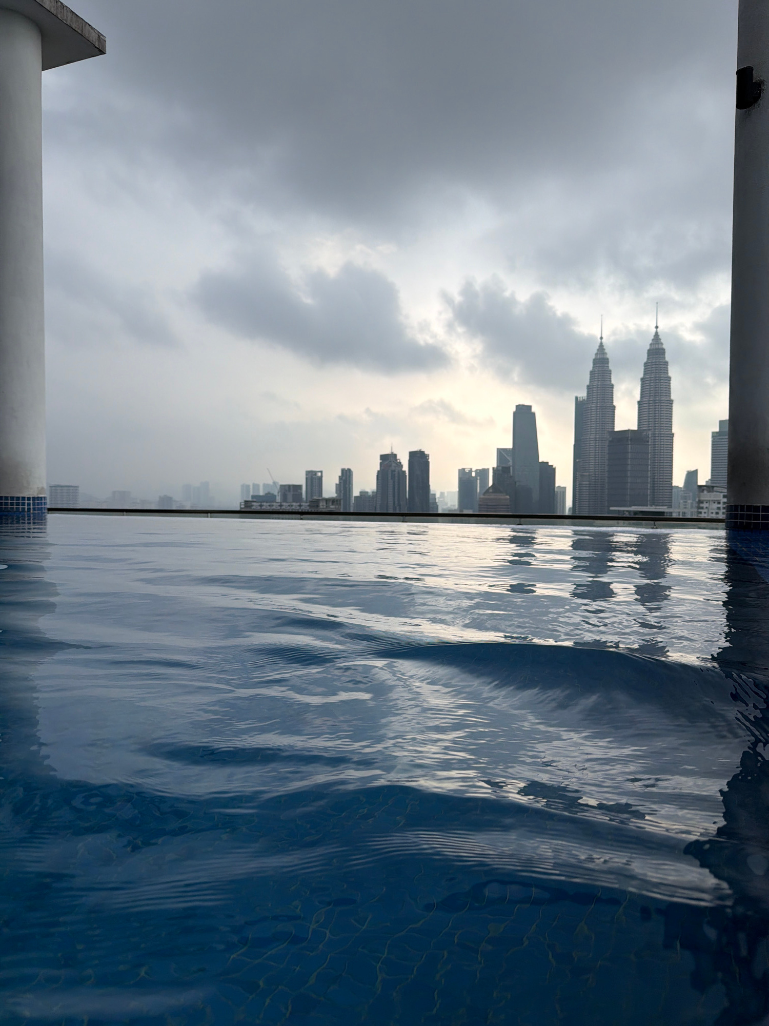 The image shows an infinity pool with the Kuala Lumpur skyline in the background. The Petronas Twin Towers are visible amidst other buildings. The sky is cloudy. The pool water is reflecting the citysβ¦read more