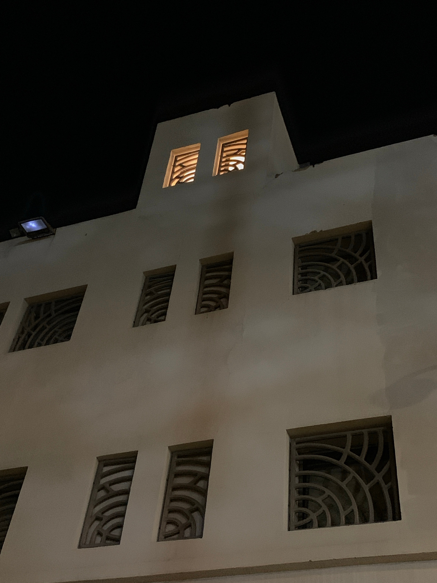 The image captures a nighttime view of a building facade from a low, upward-looking angle. The primary subject is a multi-story structure with a light-colored, possibly cream or beige, exterior. Most…read more