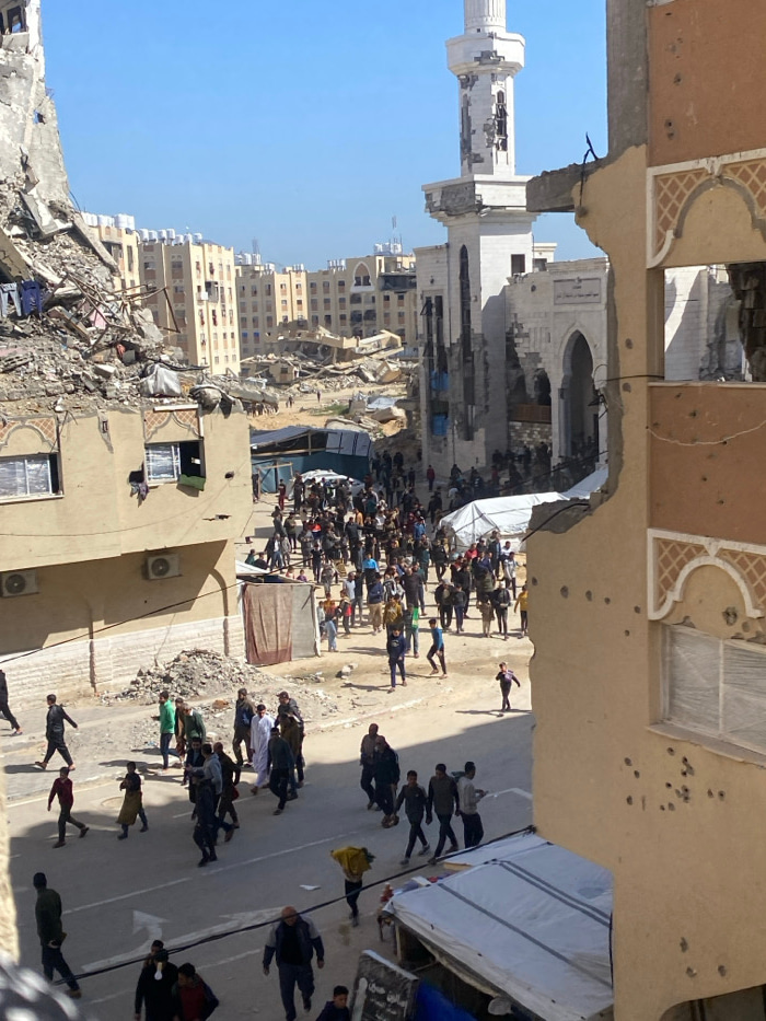 The image depicts a heavily damaged urban street scene in Khan Yunis, Palestinian Territory, under a clear blue sky. In the immediate foreground to the right, a multi-story building exhibits extensive…read more