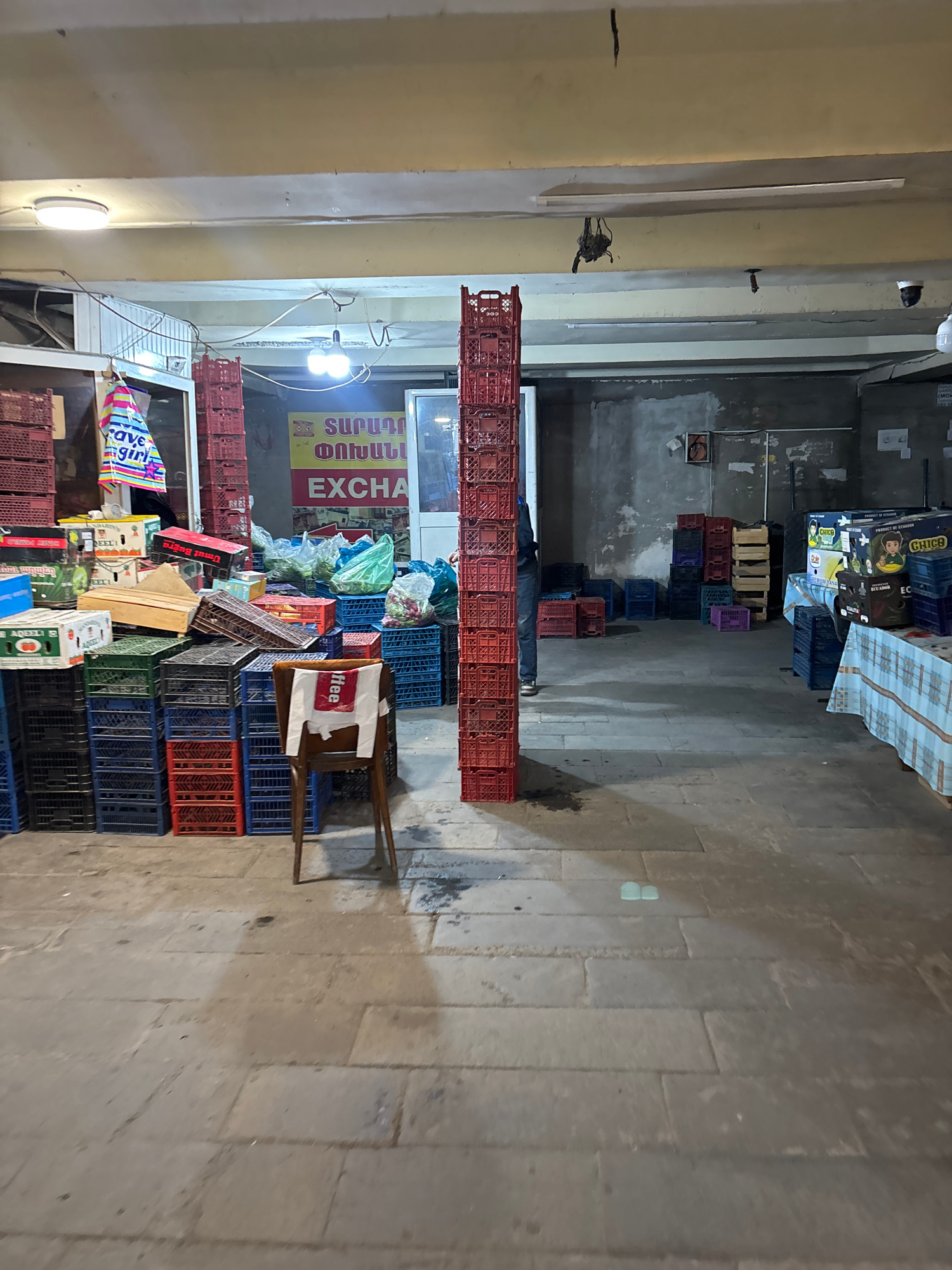 The image captures a scene within a Yerevan, Armenia market or storage area. The location appears to be an indoor market or large indoor stall, identified by the stacked plastic crates and produce. A…read more