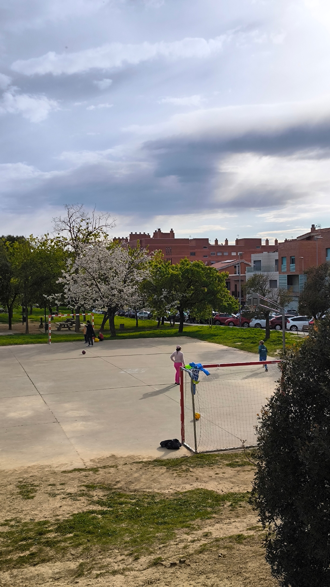 The photo shows a park in Ripollet, Spain. The park has a concrete play area with a soccer goal set up in the foreground. Several people are present, some playing with a ball and others standing. In t…read more