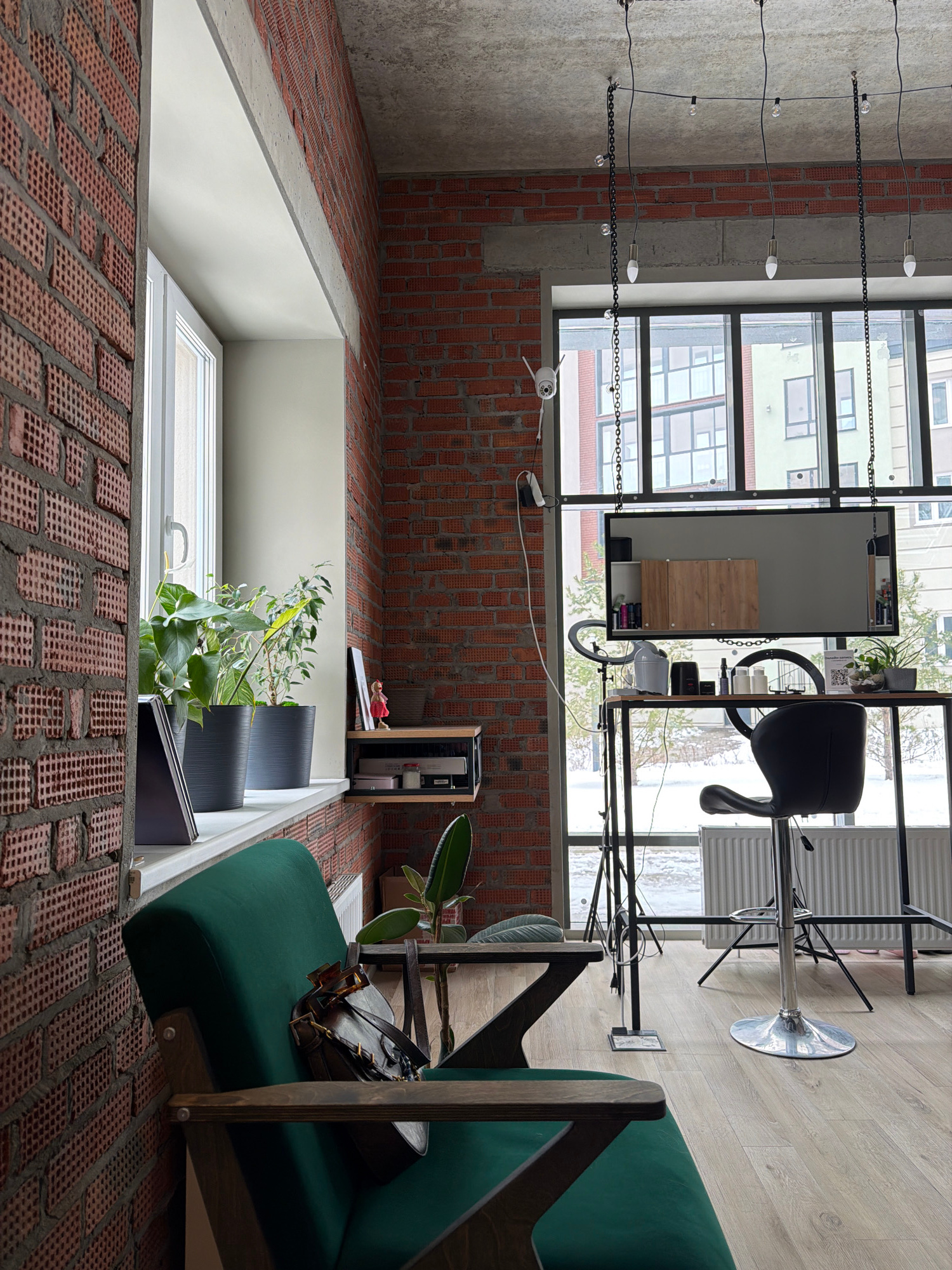 The image depicts an interior space with a mix of architectural elements and furnishings. Exposed brick walls are prominent, contrasting with smoother, likely plastered, sections. Natural light floods…read more