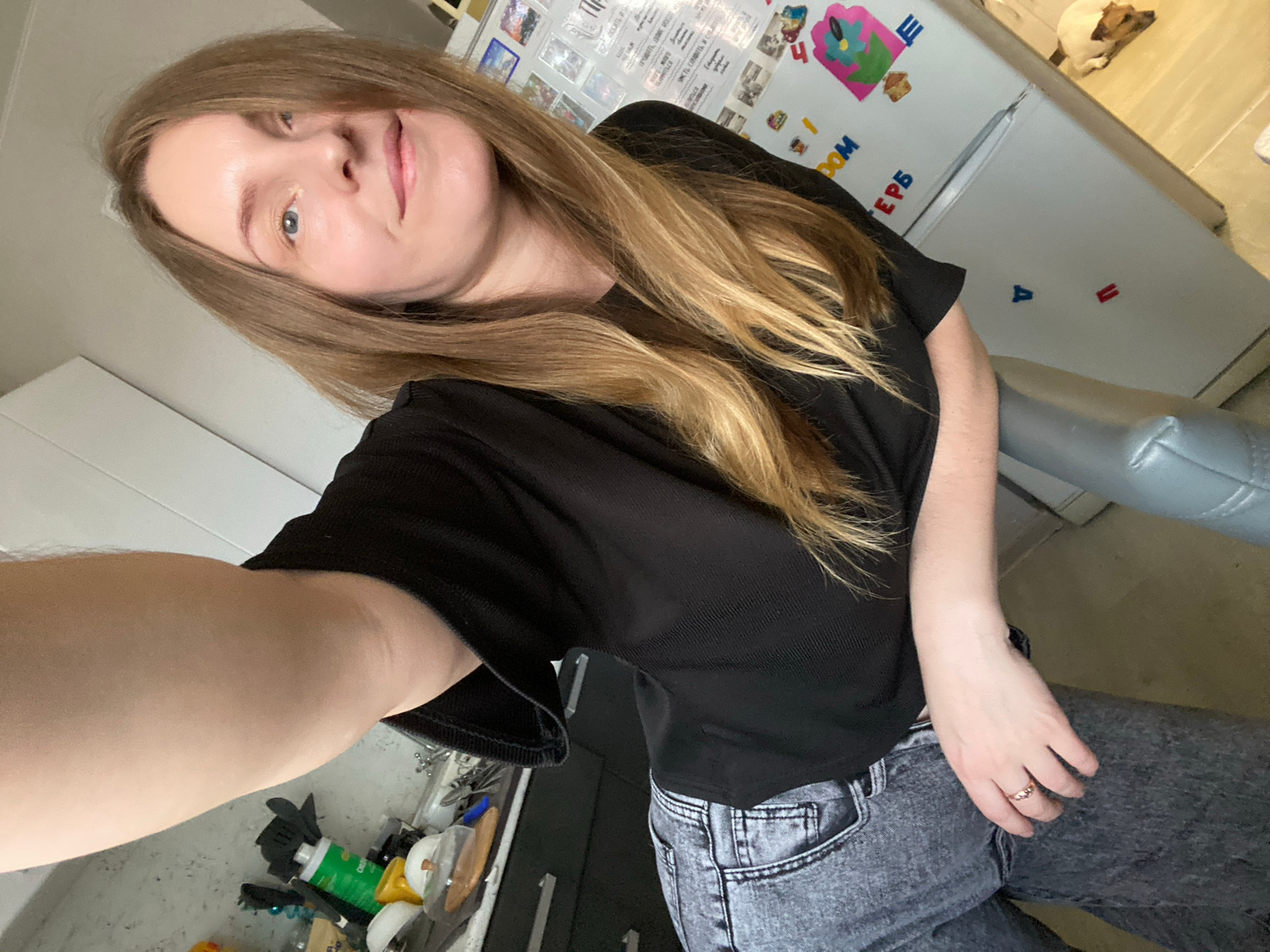A woman with long blonde hair and blue eyes is shown in a selfie-style image. She is wearing grey jeans and a black top. A ring is visible on her left hand. In the background, there is a refrigerator…read more