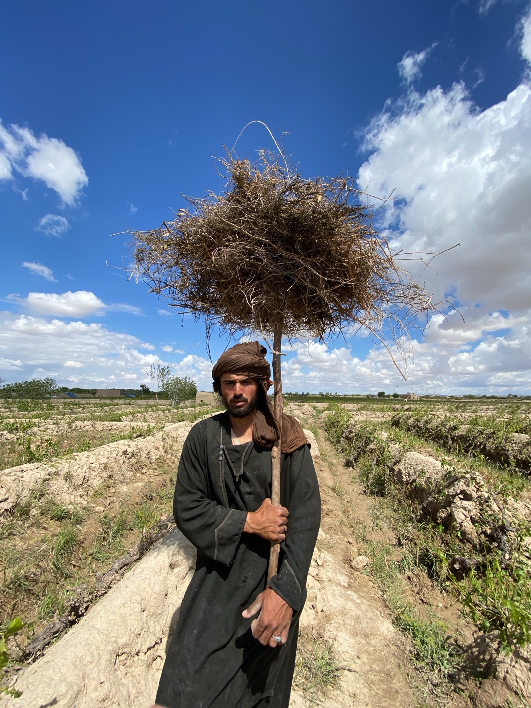A medium shot depicts a man standing on a dirt path in a field in Qazi Kariz, Afghanistan. The man, who appears to be of Middle Eastern or South Asian descent, is wearing a dark robe and a turban. He…read more