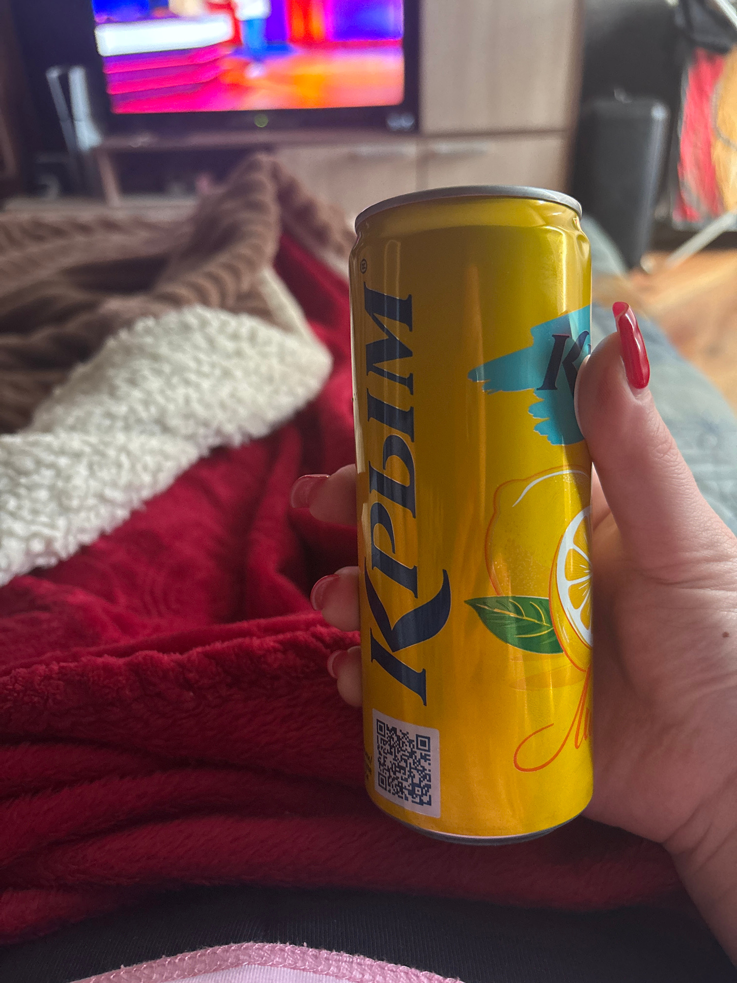 A person's hand with red nails is holding a yellow can of KPIM lemon-flavored drink. The can has an image of a lemon and a QR code. The text "KPIM" is written in dark blue, but it is reversed in the i…read more