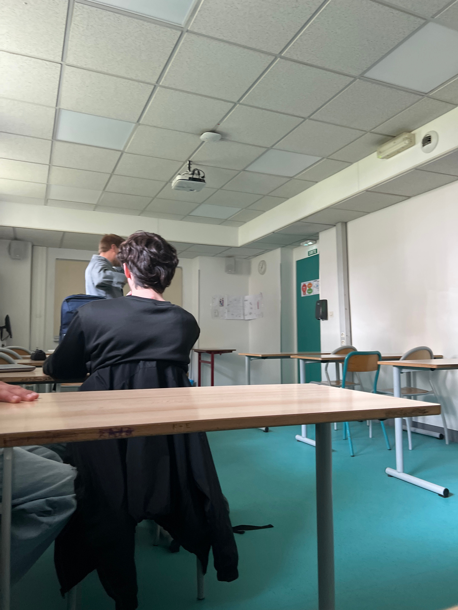 A classroom in Schiltigheim, France, shows students seated at desks. The room features a tiled ceiling with lighting fixtures and a whiteboard on the wall. Desks and chairs are arranged in rows. A per…read more