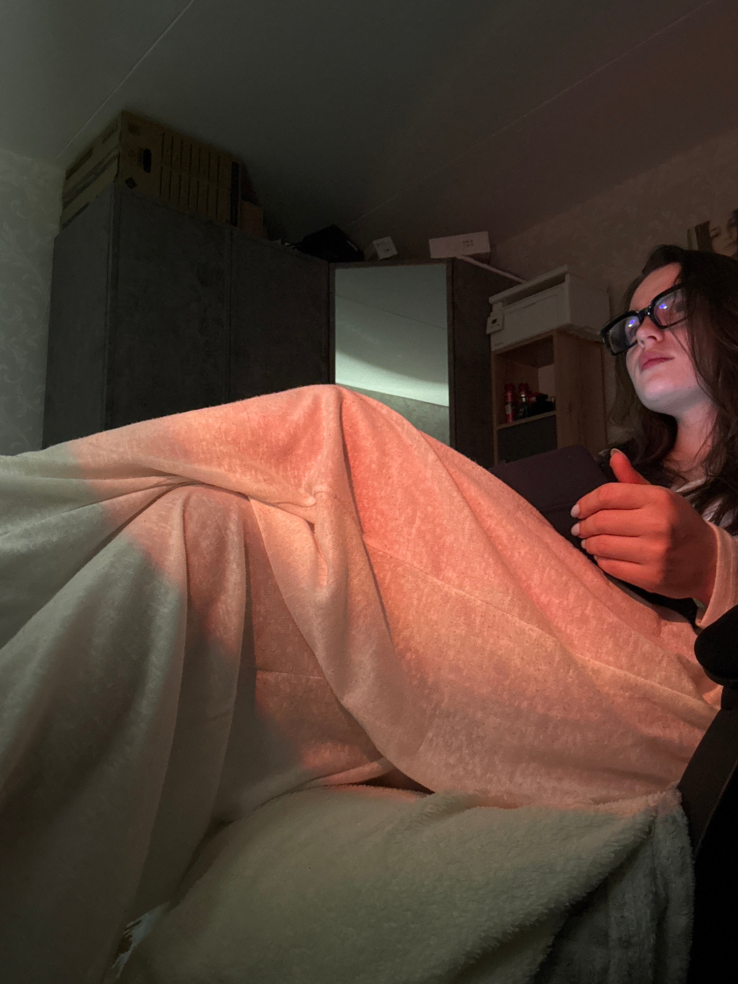 A young woman wearing glasses is partially visible in the upper-right corner of the image. She is covered with blankets that appear to be two different colors - a pinkish-white blanket on the left, an…read more