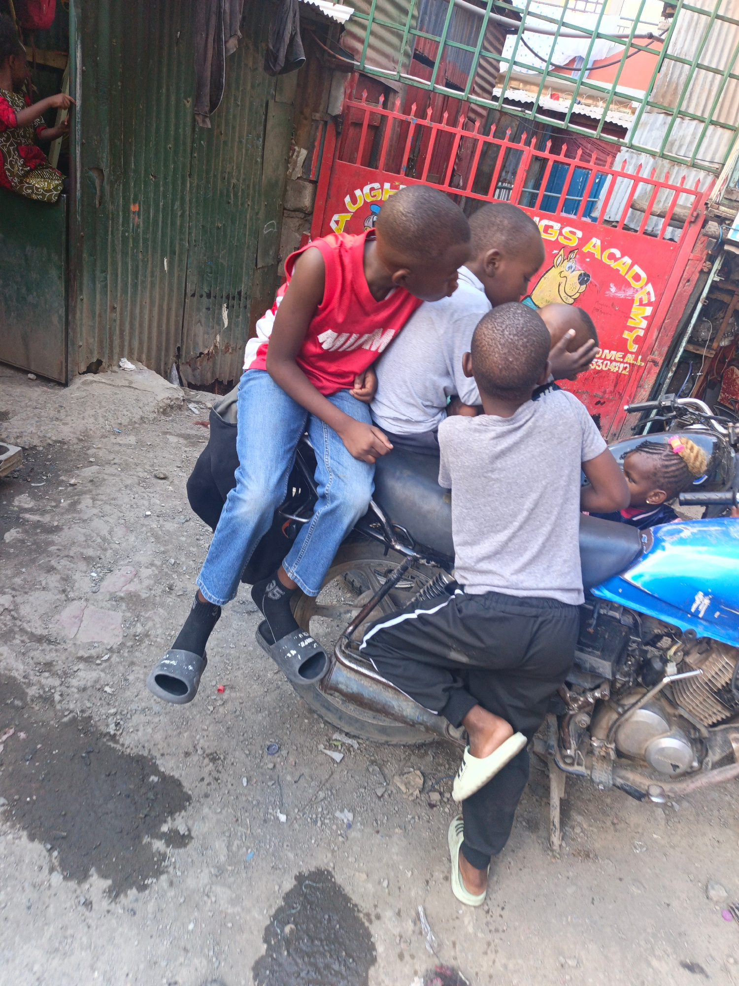 Four children are clustered around a parked blue motorcycle. One child sits on the motorcycle, wearing a red tank top and blue jeans, with black socks and slides. Another child in a grey t-shirt stand…read more