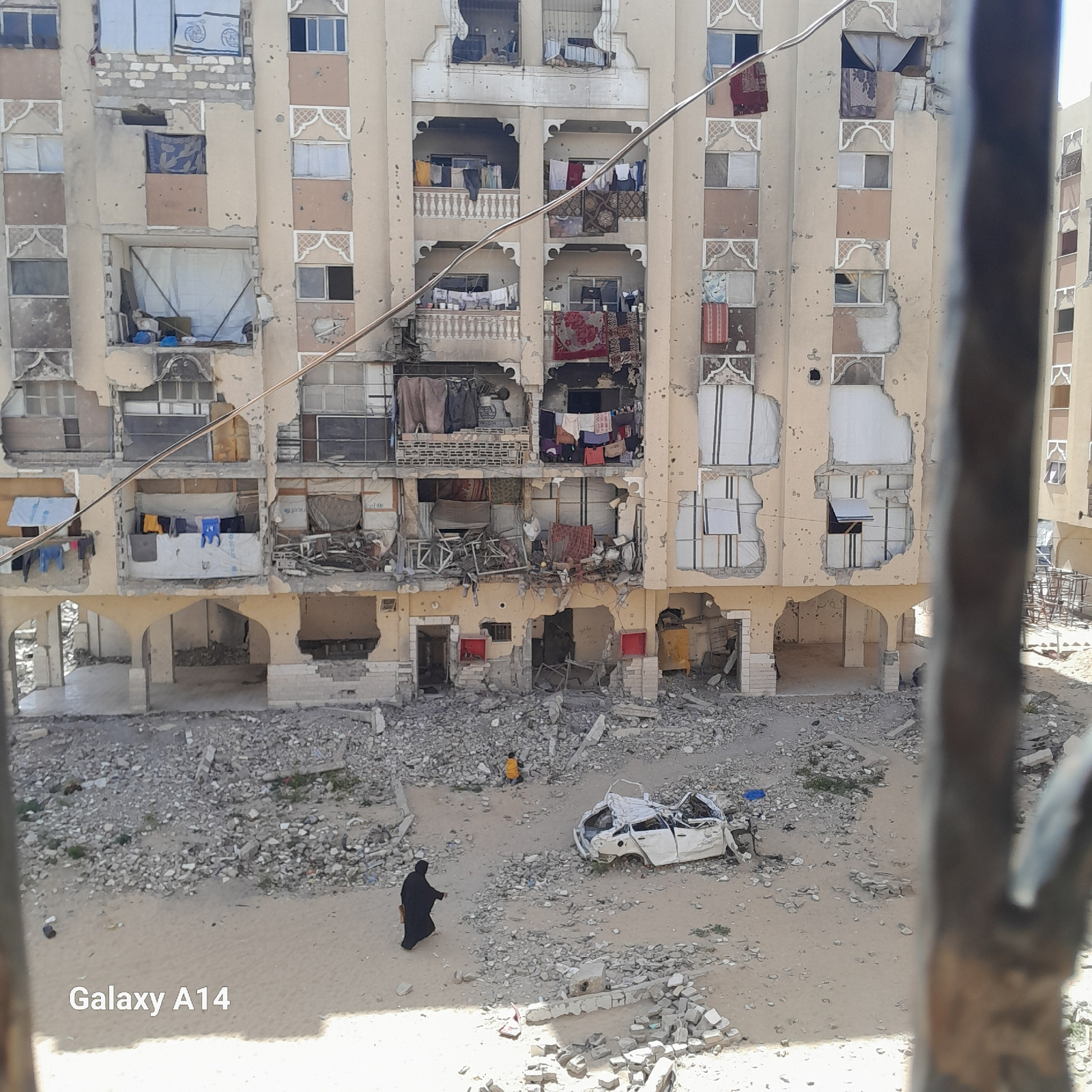 The image, likely taken in Khan Yunis, Palestinian Territory, shows a severely damaged multi-story building. The structure has sustained extensive destruction, with large sections of walls and balconiβ¦read more