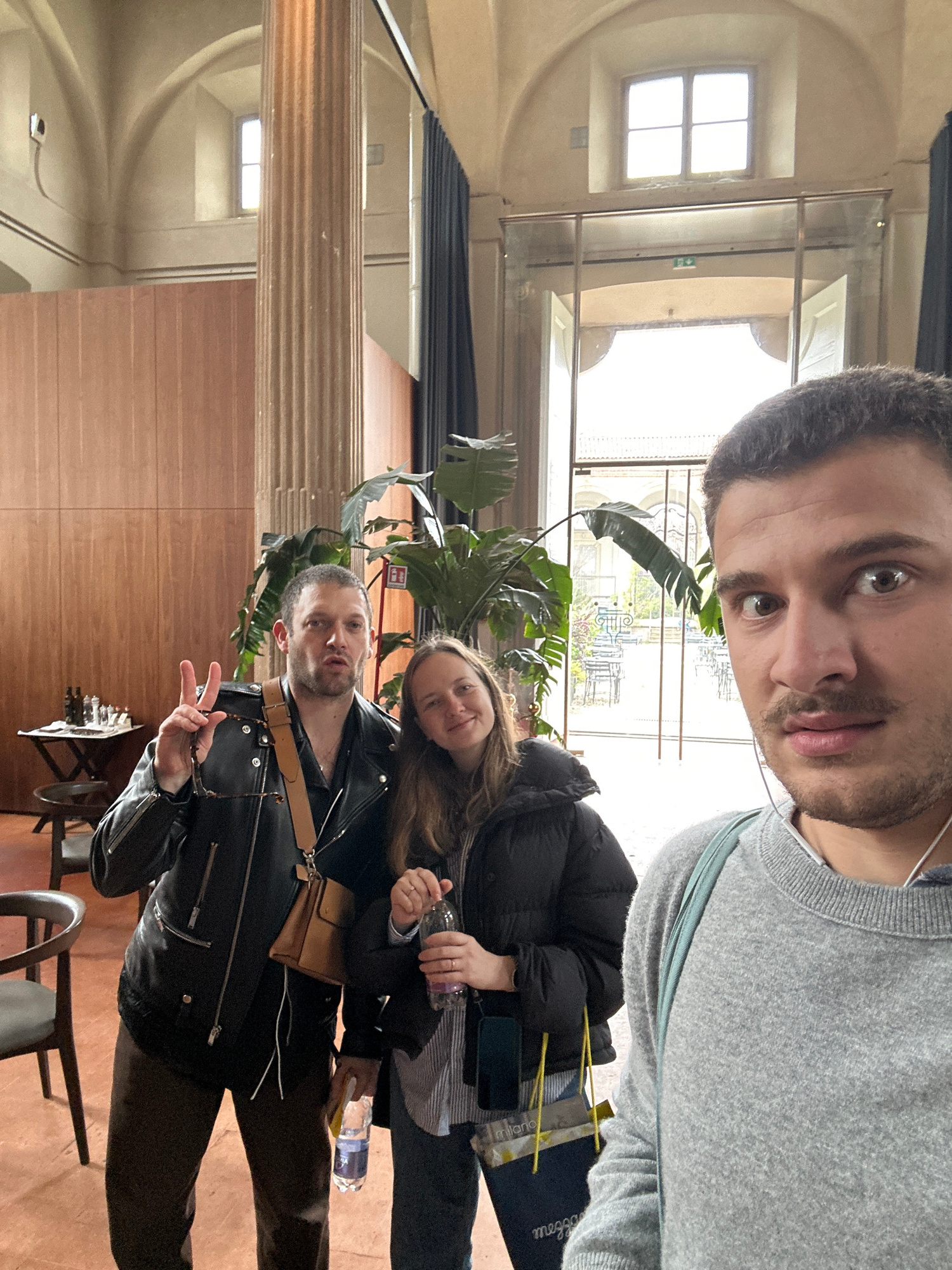 A selfie photograph captures three individuals inside a grand historic building in Milan, Italy, featuring classical architecture and an adjoining outdoor courtyard cafe. The interior displays high va…read more