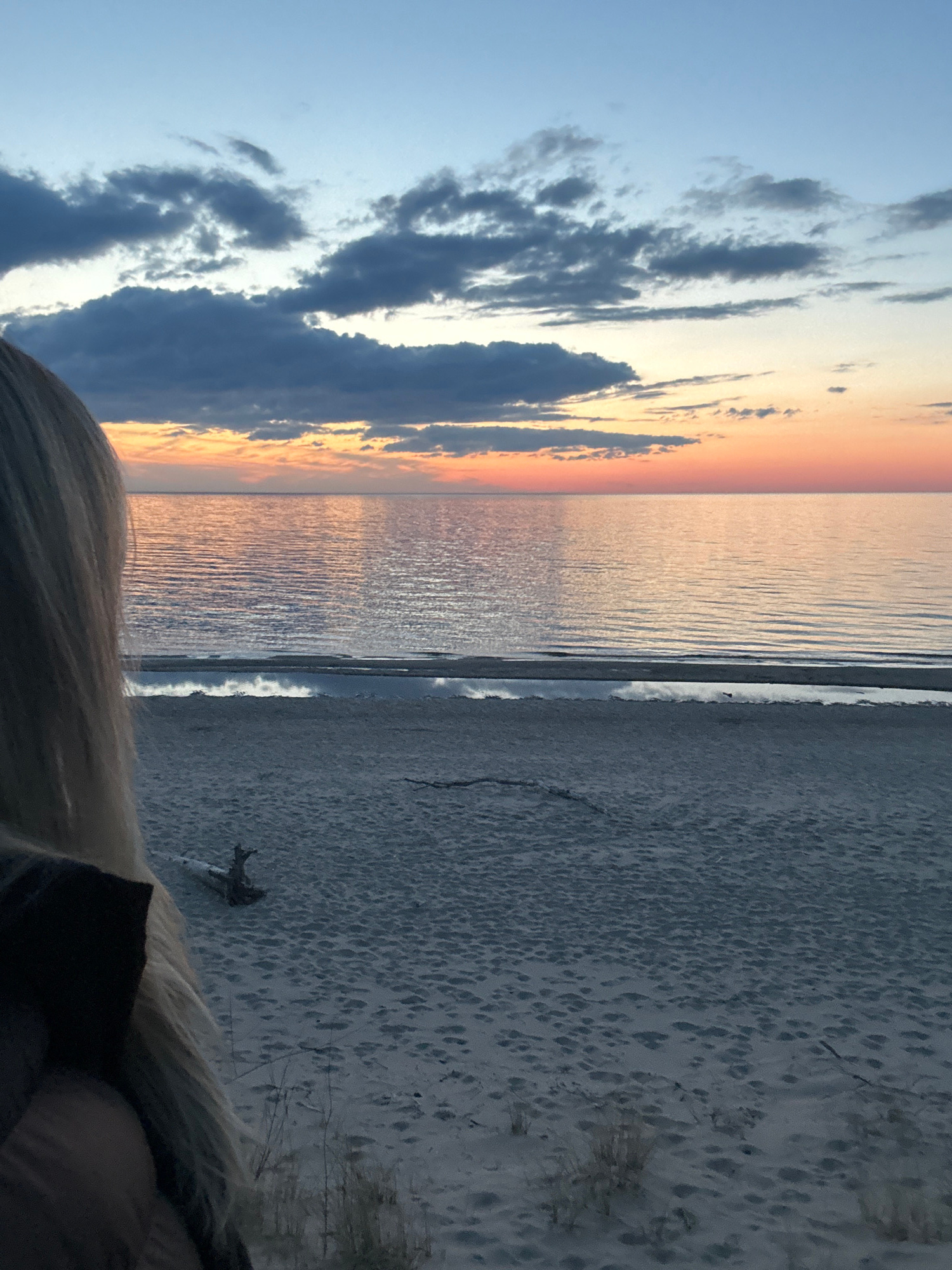 The image shows a beach landscape in Kalngale, Latvia, at sunset. The sky is split between blue and orange hues, with scattered grey clouds. The Baltic Sea reflects the colors of the sunset. The sandy…read more