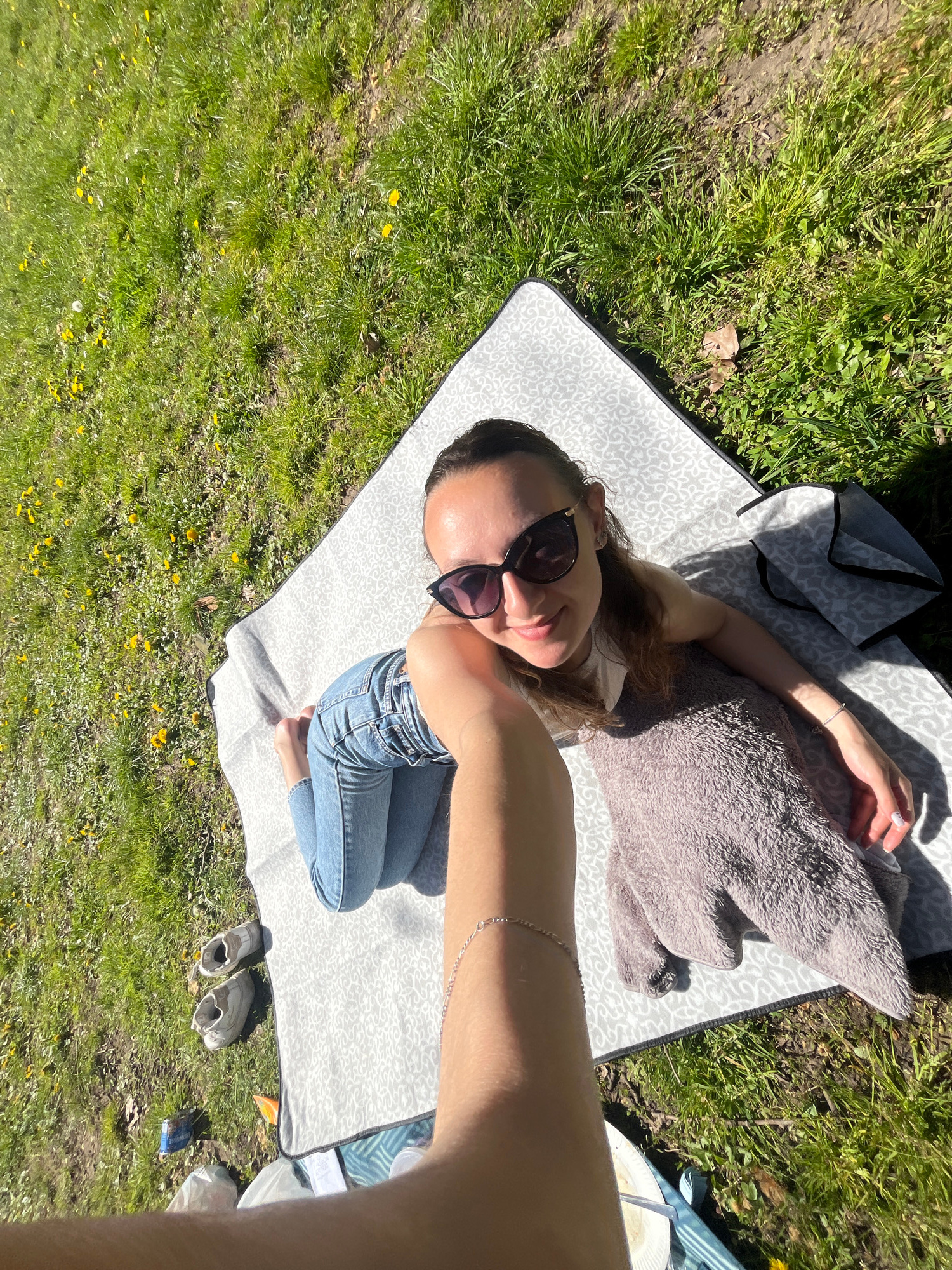A woman wearing jeans and sunglasses is lying on a patterned blanket in a grassy area, possibly a park. The woman is facing the camera, and the perspective suggests a selfie. A grey blanket or towel i…read more