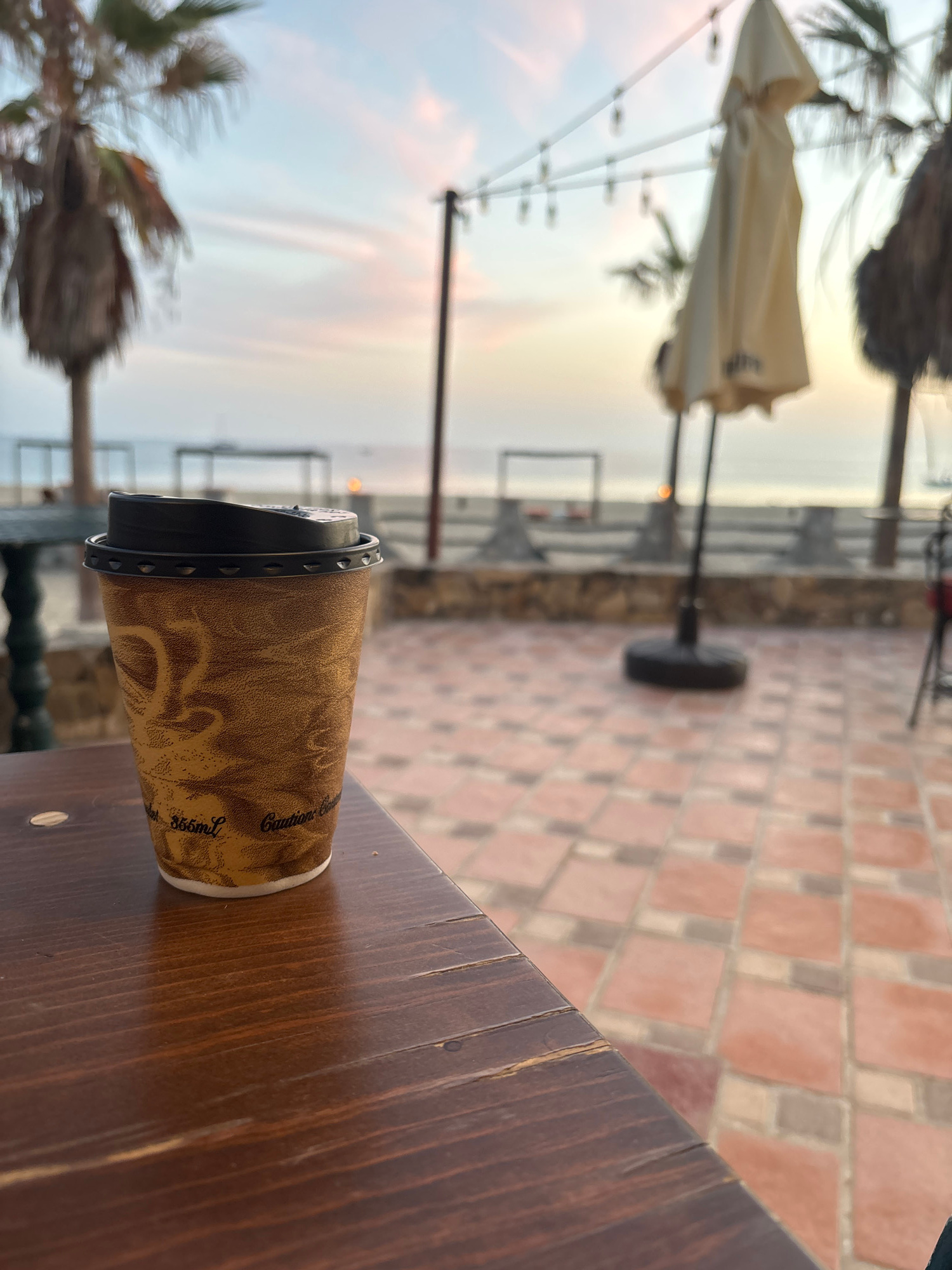 The image shows a coffee cup sitting on a wooden table in an outdoor setting. In the background, the beach is visible, with palm trees and umbrellas lining the shore. The ground is paved with red bric…read more