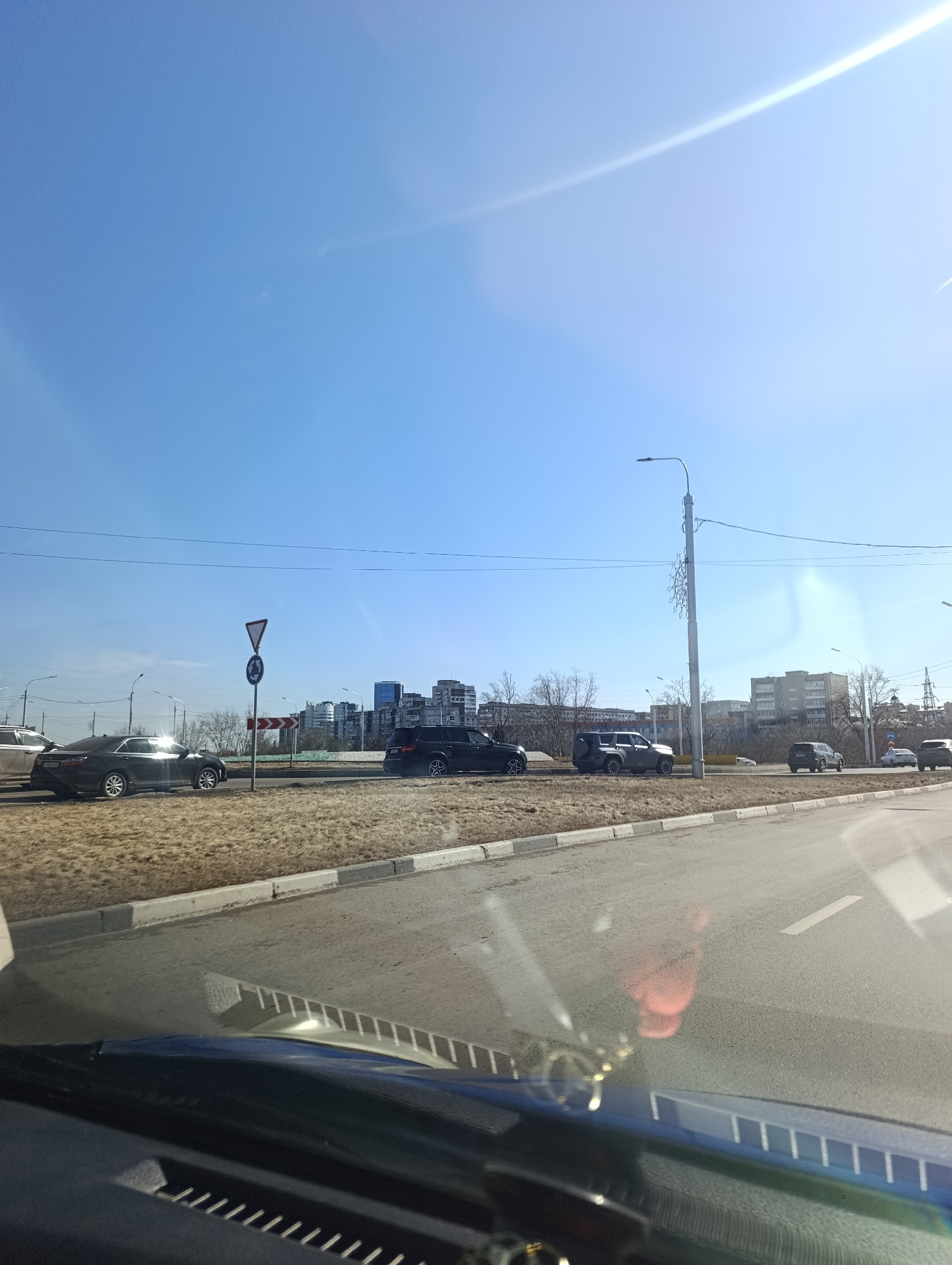 The image depicts a street scene in Krasnoyarsk, Russia on a clear, sunny day. The view is from inside a vehicle, likely the driver's perspective. On the other side of a median strip, several cars are…read more