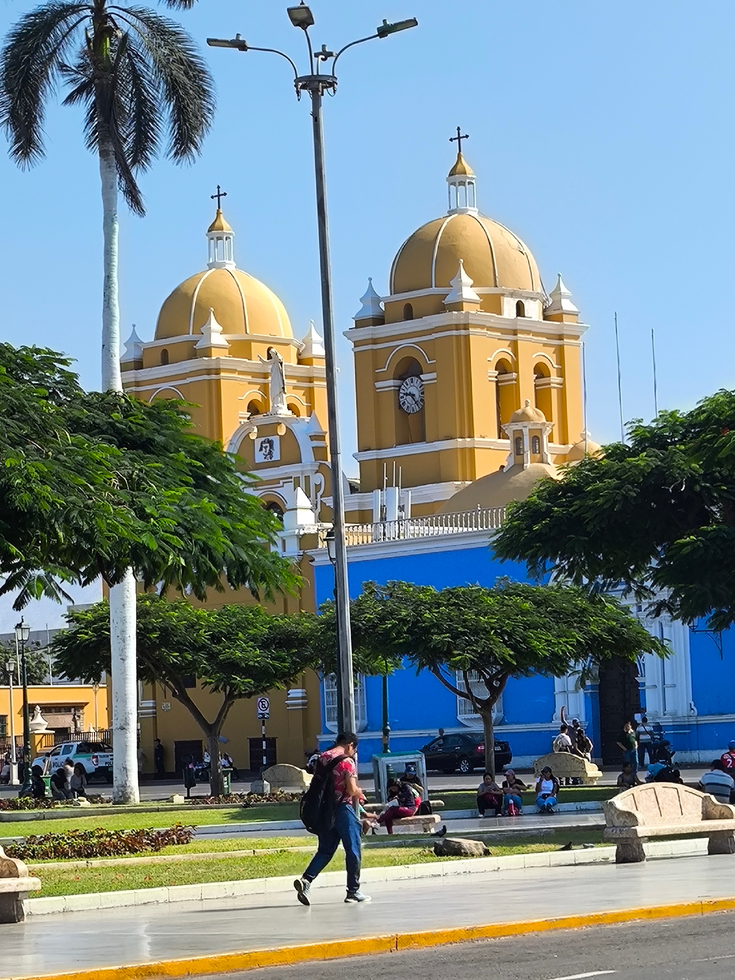 The image depicts a scene in Trujillo, Peru, focusing on the Plaza de Armas and the Basilica Cathedral. The cathedral has a bright yellow and blue facade with two prominent yellow domes topped with cr…read more