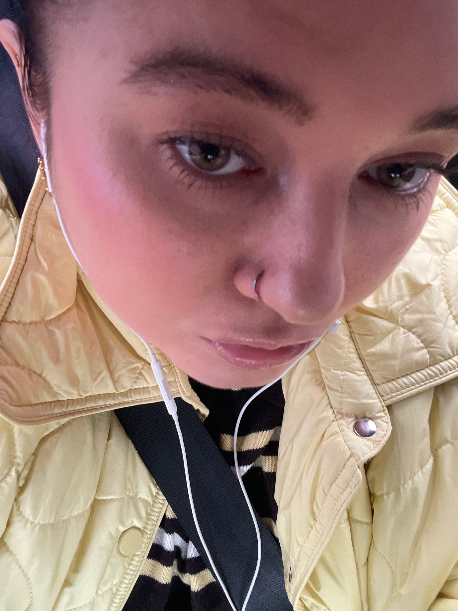 A close-up, slightly angled selfie-style image shows a person with light skin and brown eyes wearing a yellow quilted jacket. White earphones are in their ears. A black and white striped garment is viโฆread more