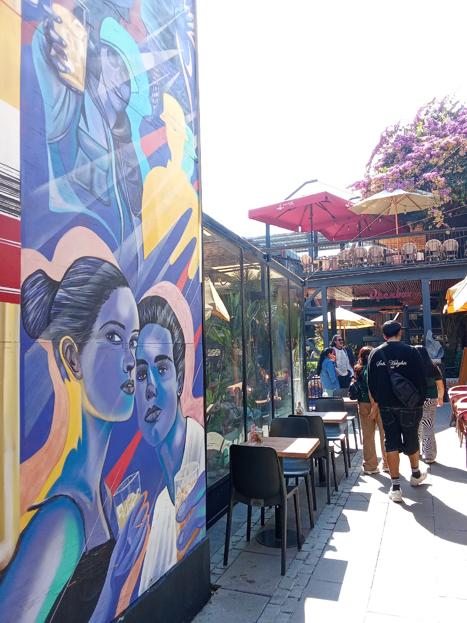 The image shows an outdoor scene in Providencia, Chile. On the left, a mural depicts stylized figures in blue hues, holding glasses and appearing to celebrate. To the right, an open-air restaurant pat…read more