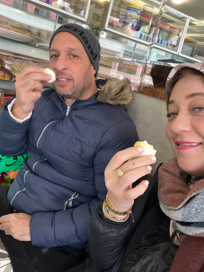Two individuals, a male and a female, are depicted in a mid-shot within what appears to be a bakery or small grocery store in Meknes, Morocco. The male, positioned on the left, is approximately 40-50…read more
