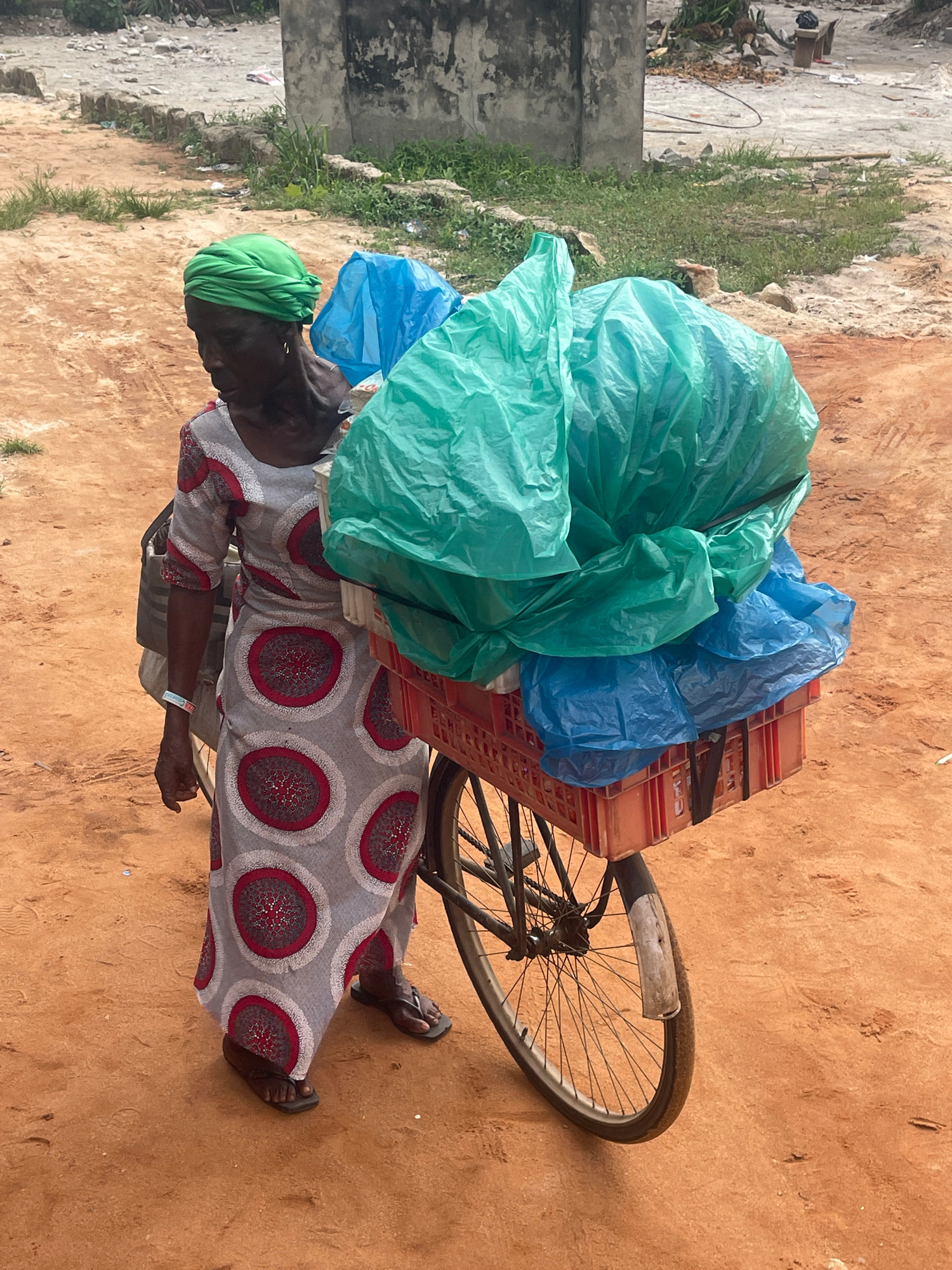 An elderly black woman with a green headscarf is pushing a bicycle along a dirt path. The bicycle has a crate strapped to the back, which is filled with green and blue plastic bags. The woman is weari…read more