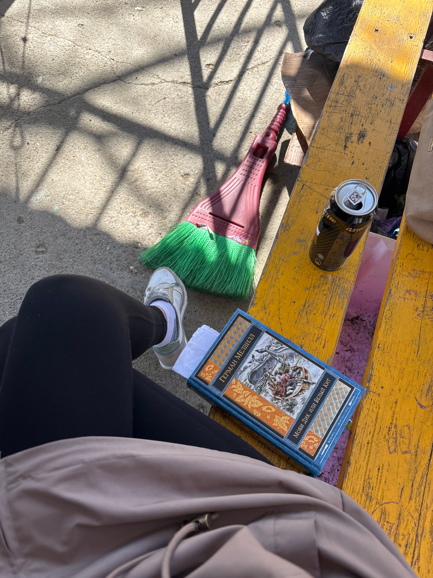 Captured from an elevated, high-angle perspective, the image presents a scene on what appears to be an old, yellow-painted wooden bench, likely situated outdoors. The setting is likely Sochi, Russia,…read more