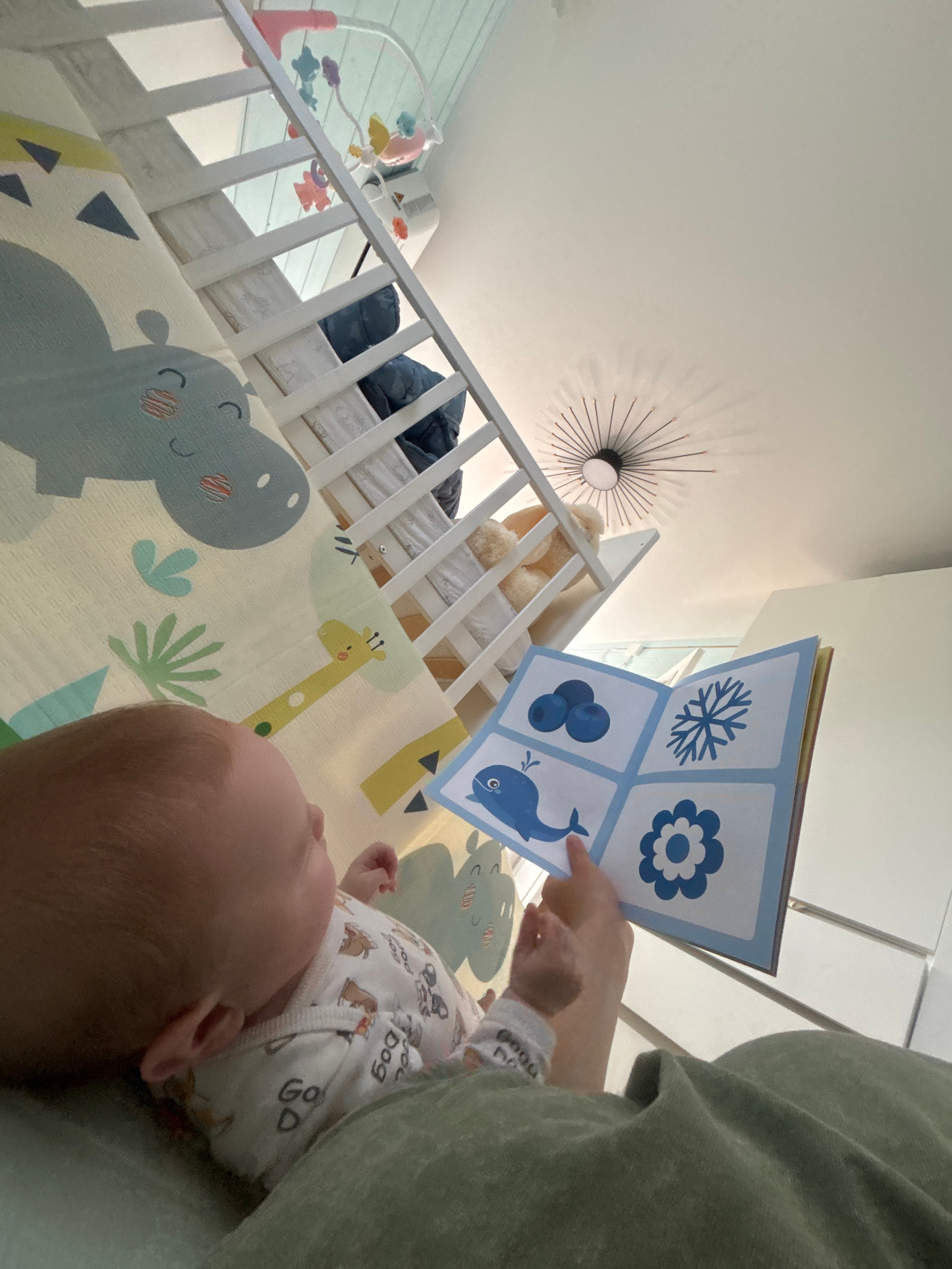 This image captures an intimate moment in a nursery or bedroom, viewed from an upward angle, possibly from the perspective of the baby or a high-held camera. The primary subjects are a baby and an ad…read more