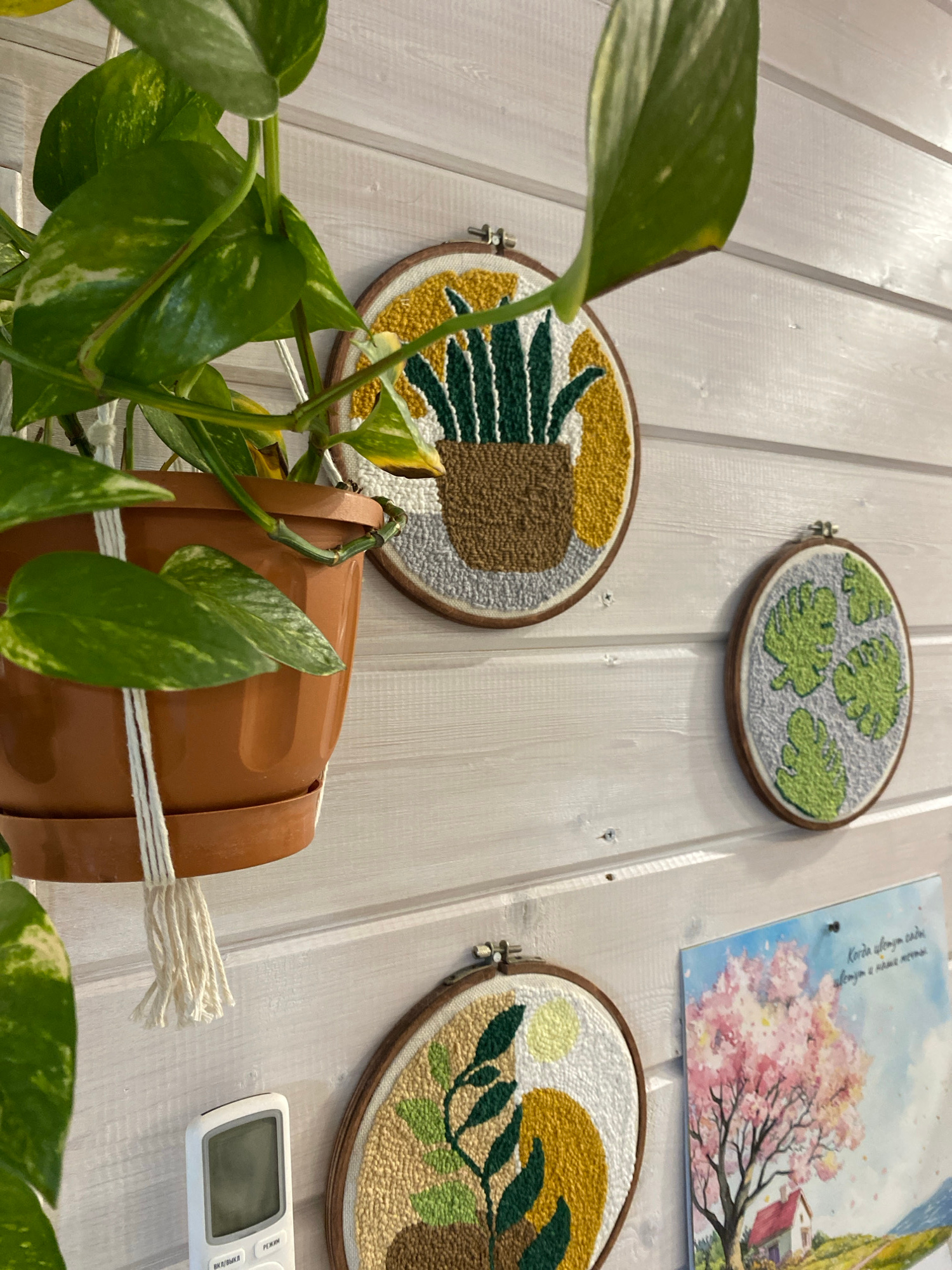The image shows a plant in a brown pot hanging against a white wooden wall. On the wall are three framed needlepoint designs, one with green leaves, another with a plant in a pot, and a third with a l…read more