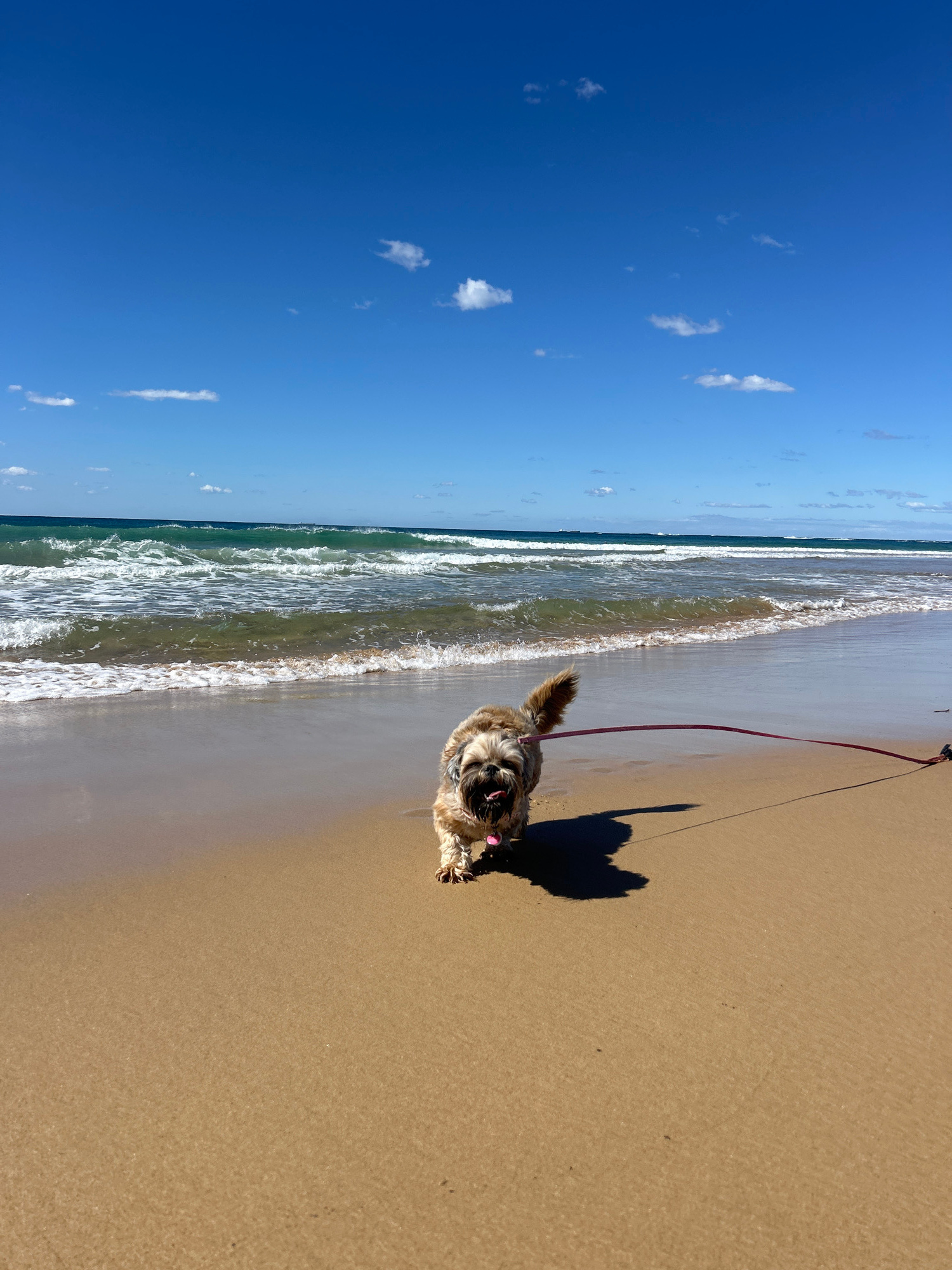 The image shows a small, brown and gray dog on a leash standing on a sandy beach in Bulli, Australia. The dog is facing the camera, with its tongue sticking out. The beach is wide and sandy, with a th…read more