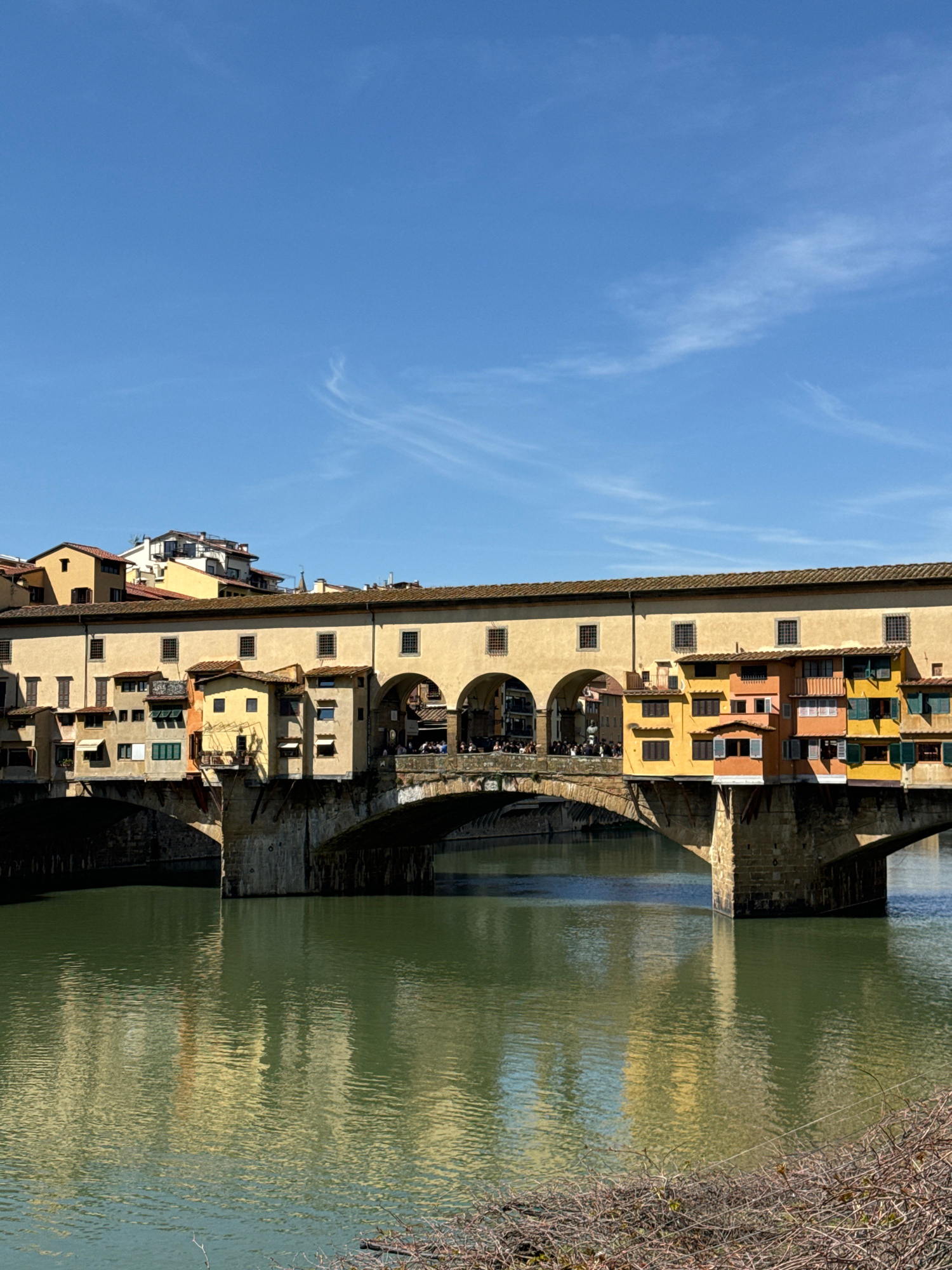 This image shows a section of the Ponte Vecchio in Florence, Italy, viewed from a side angle. The bridge's characteristic shops and buildings are visible along its length, with their reflections cast…read more