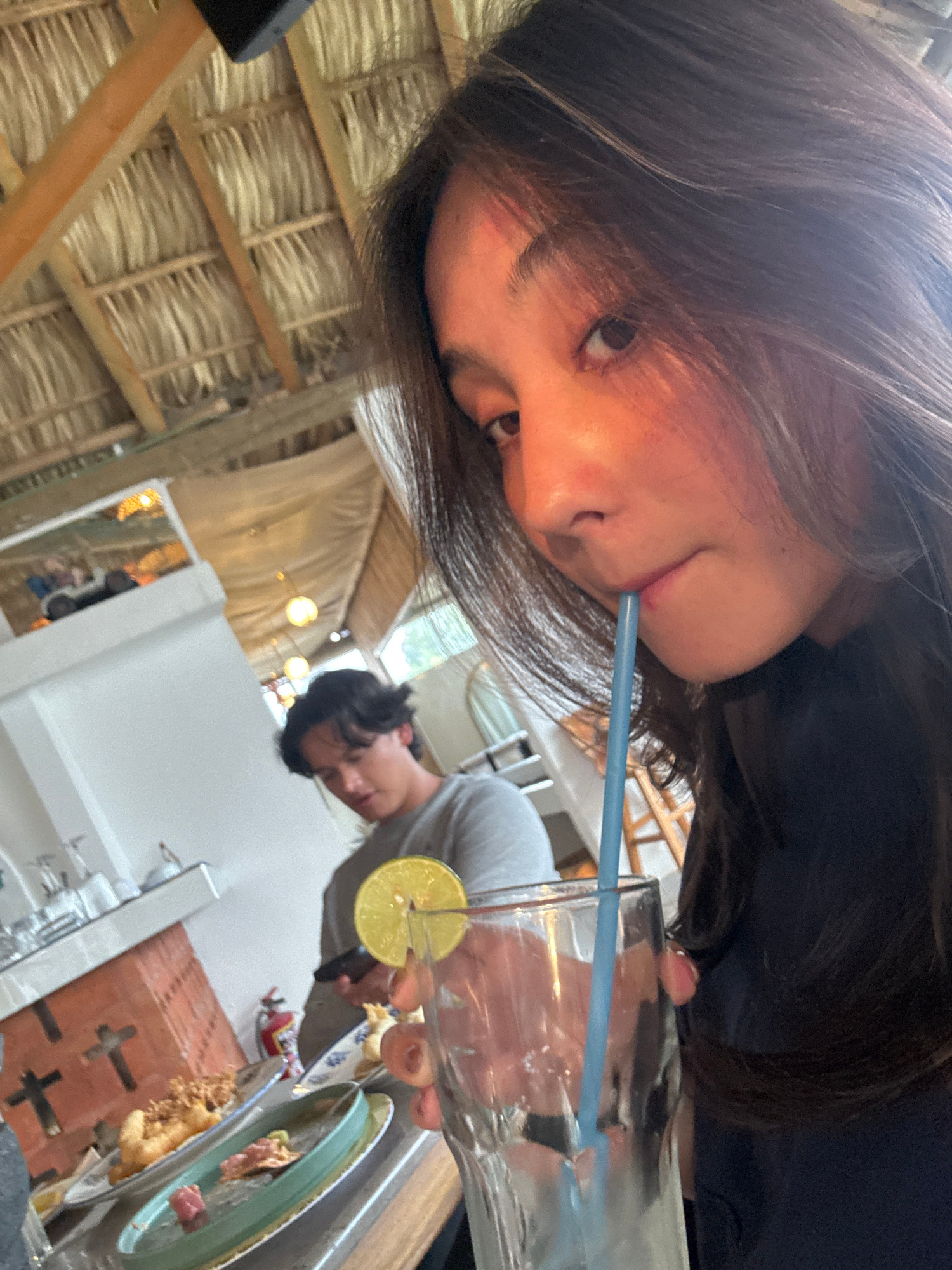 A person with dark hair is drinking from a glass with a blue straw. The glass contains a slice of lemon. Another person is sitting opposite them, wearing a grey shirt. Plates of food and cutlery are v…read more