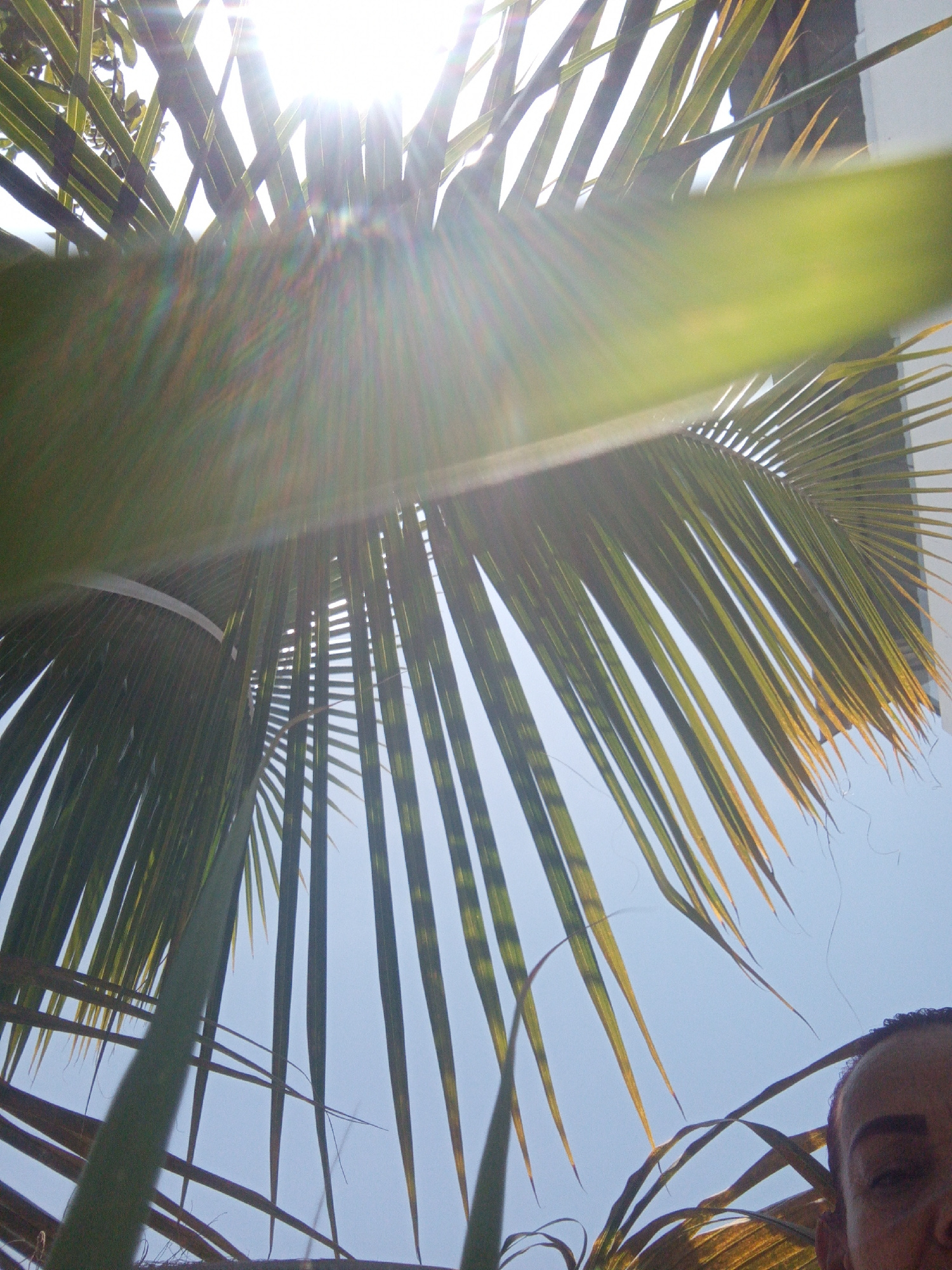 The image, likely taken in Laredo, Peru, is a low-angle shot looking up through the fronds of a palm tree towards a bright sun. The sun's rays are diffused and create a starburst effect. The palm fronβ¦read more