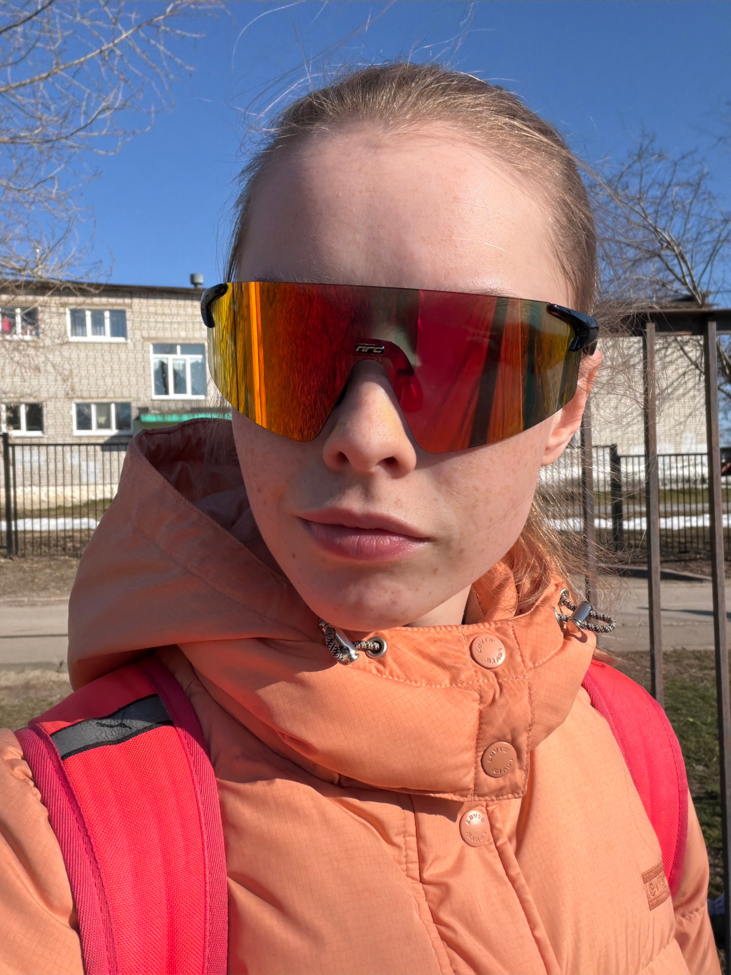 A medium close-up shot depicts a person wearing oversized, orange-mirrored ski goggles and a peach-colored down jacket with red straps from a backpack visible over the shoulders. The jacket has visiblβ¦read more