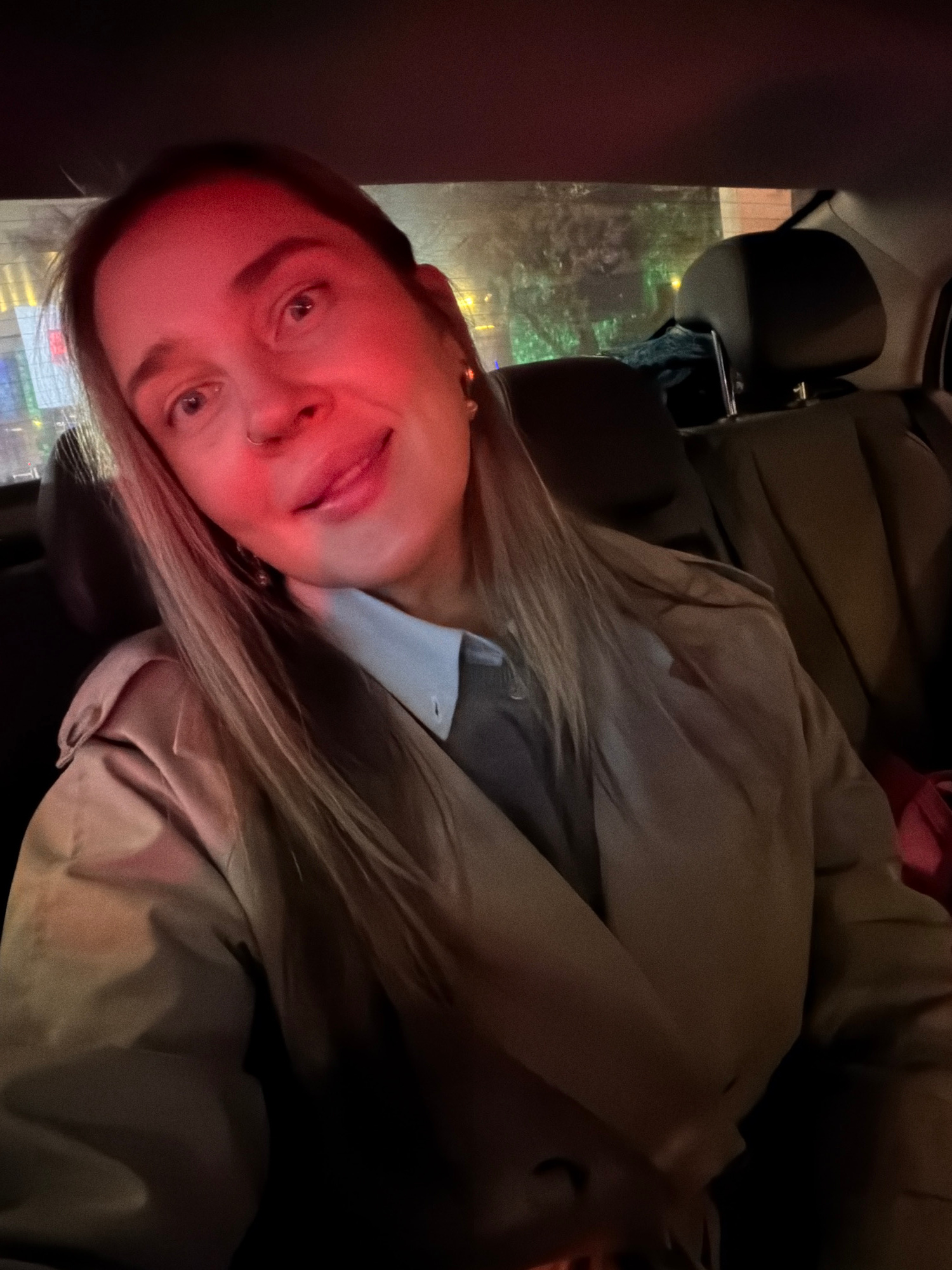 A woman with fair skin and long blonde hair is seated in a vehicle, likely a car, during nighttime in Moscow, Russia. She is wearing a light-colored jacket or coat and a pale shirt or blouse underneat…read more
