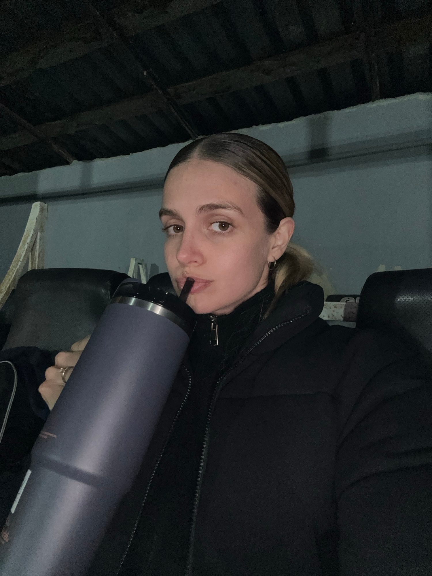 The image, rotated 90 degrees counter-clockwise, features a young woman looking directly at the viewer with a neutral expression. She is in a dimly lit, possibly indoor or covered setting, suggesting…read more