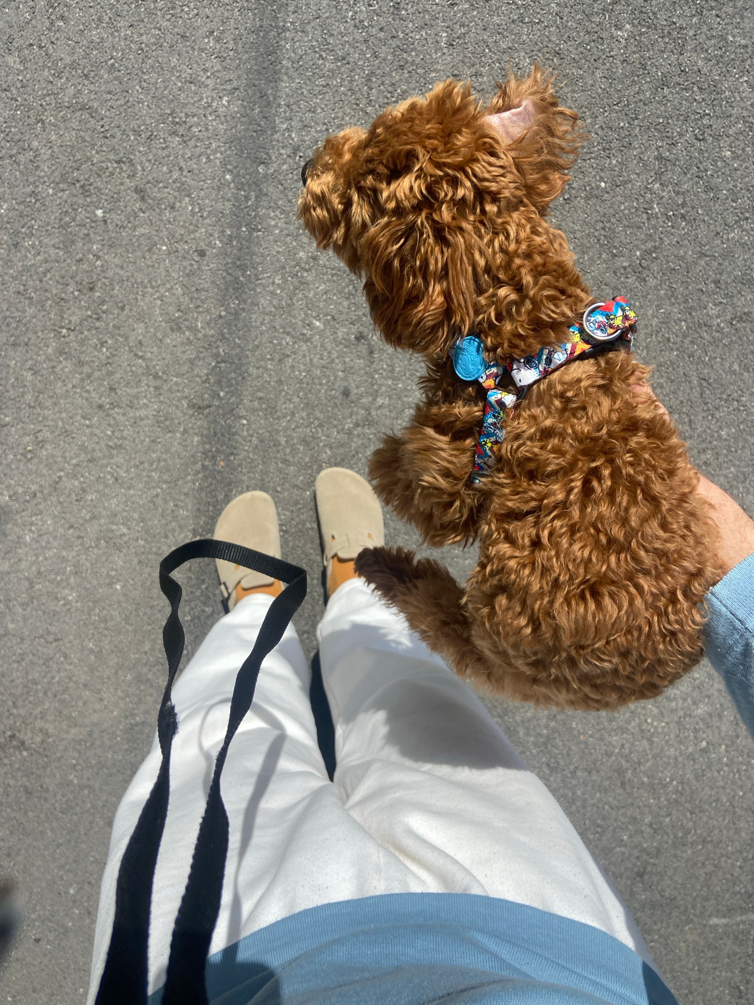 An aerial shot shows a person holding a reddish-brown poodle in their arms on a gray asphalt surface. The person is wearing white pants with black stripes down the sides, a light blue shirt, and light…read more