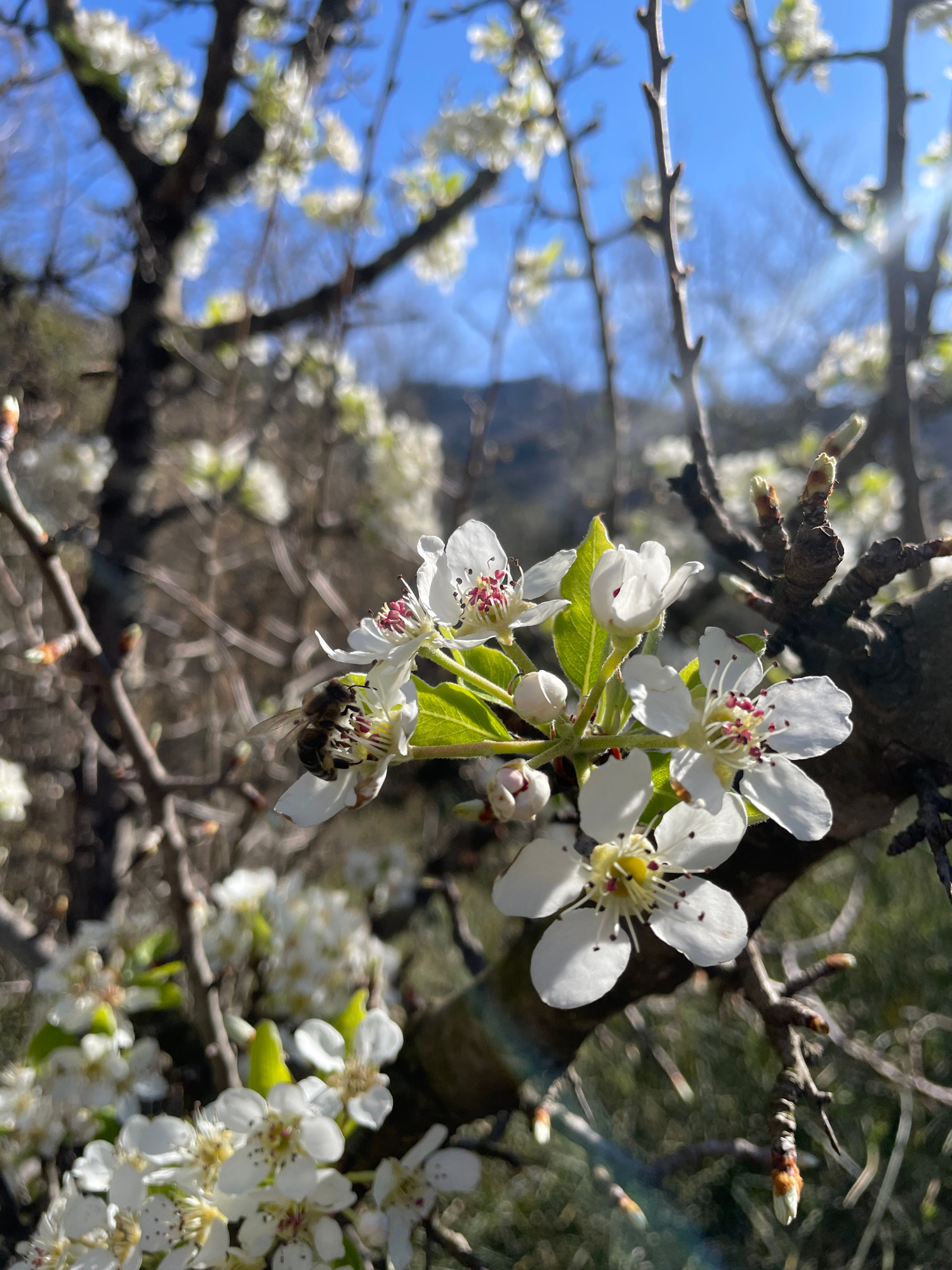 The image depicts a close-up outdoor scene in Boreti, Montenegro, focusing on a flowering tree branch. A single bee, with a dark, segmented body and transparent wings, is actively engaged with the pis…read more