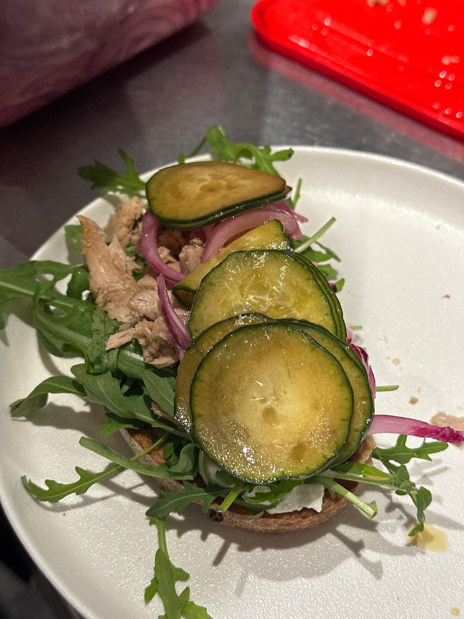 A close-up, overhead shot shows a single open-faced sandwich on a white plate. The sandwich is comprised of a slice of bread topped with arugula, tuna, sliced red onions, and sliced cucumbers. The pla…read more