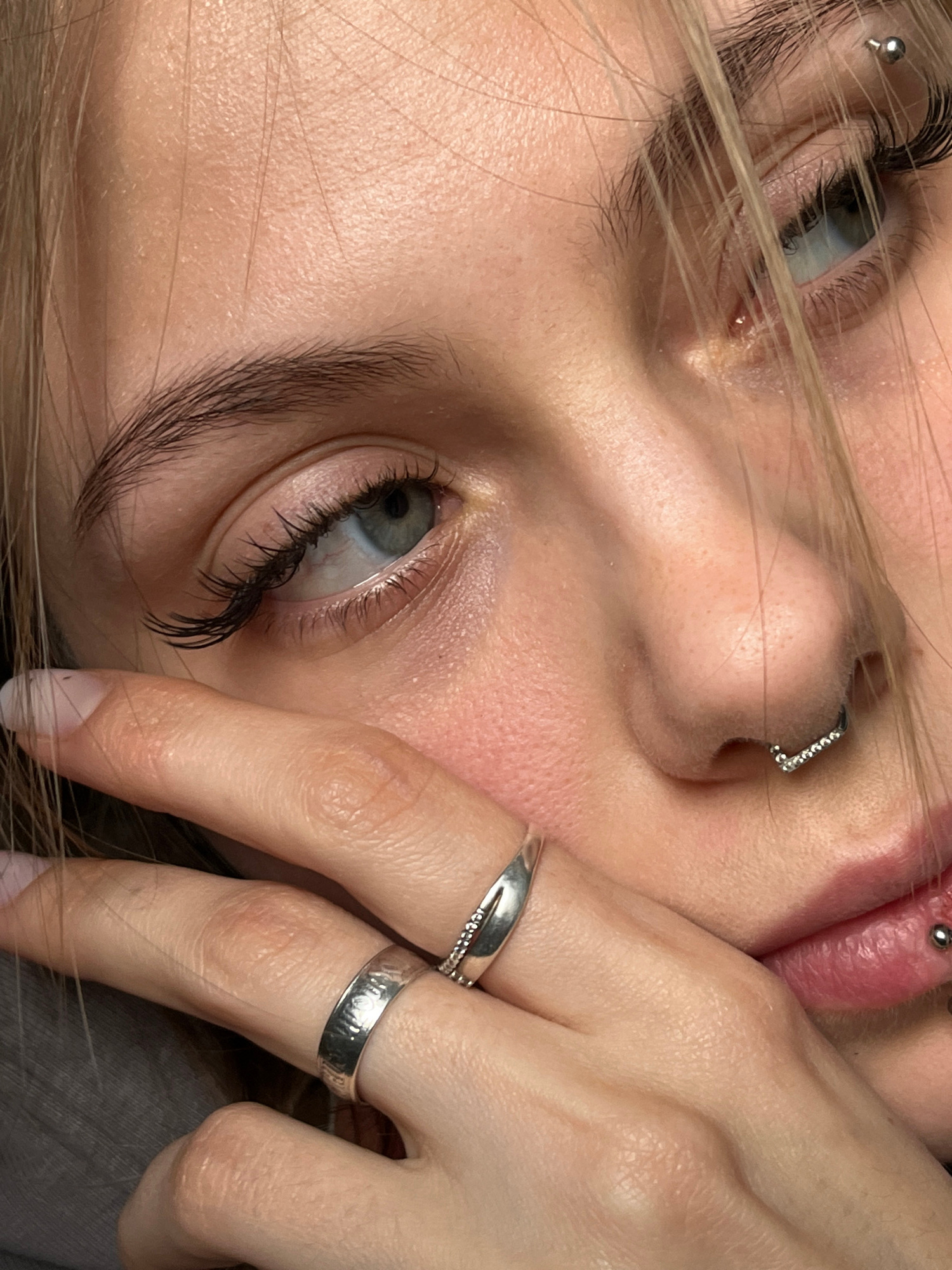 A close-up shot presents a young woman's face at an oblique angle. Her skin has a fair complexion, and the fine blonde hair is partially obscuring her face. Both eyes are visible, revealing light-colo…read more