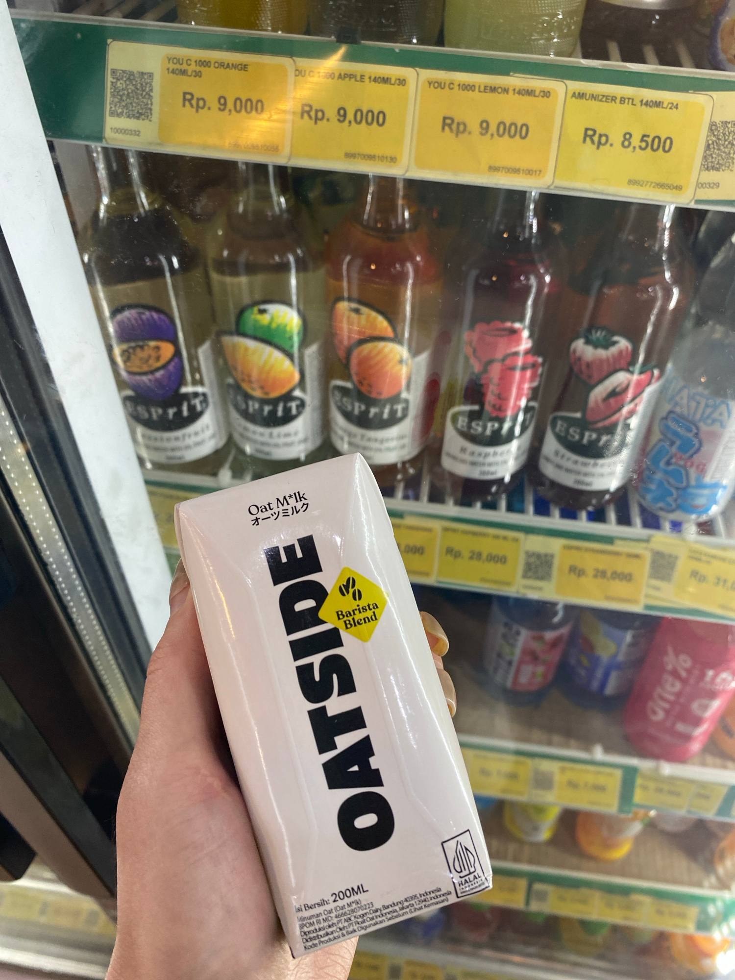 A person is holding a carton of "Oatside Barista Blend Oat Milk" in front of a refrigerated display case at a store in Kuta Selatan, Indonesia. The Oat Milk carton is white with black lettering. The r…read more
