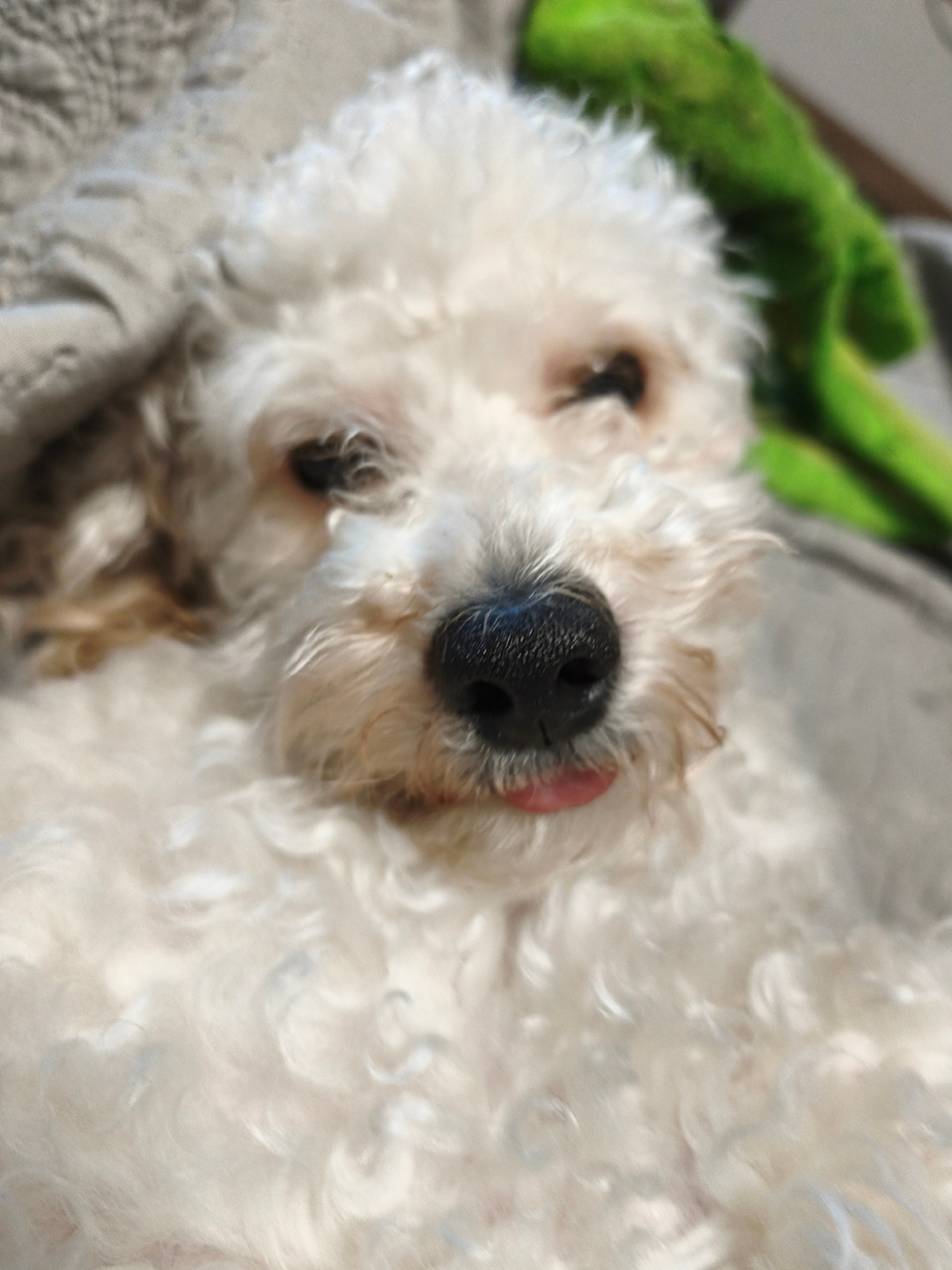 A close-up portrait shot captures a small, fluffy white dog, likely a poodle or bichon frise, in a relaxed state. The dog is lying down, with its head slightly tilted, and its eyes appear partially cl…read more