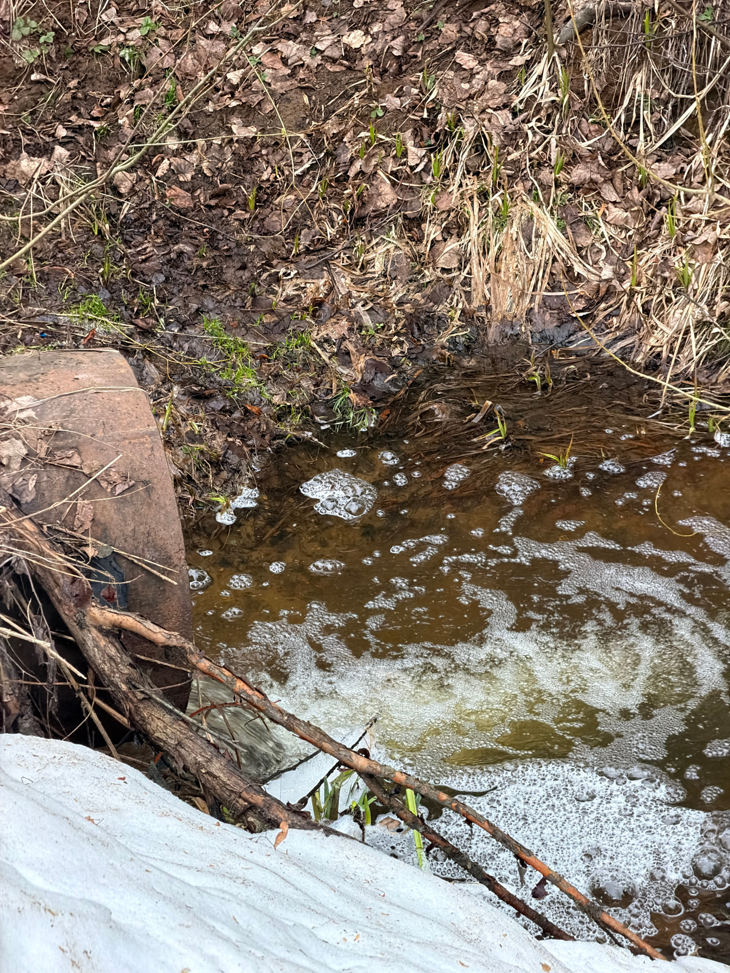 The image shows a drainage area in a natural setting near the city of Chaikovsky, Russia. Water with significant foaming is flowing from under snow near a large, rusted cylindrical drainage pipe. The…read more