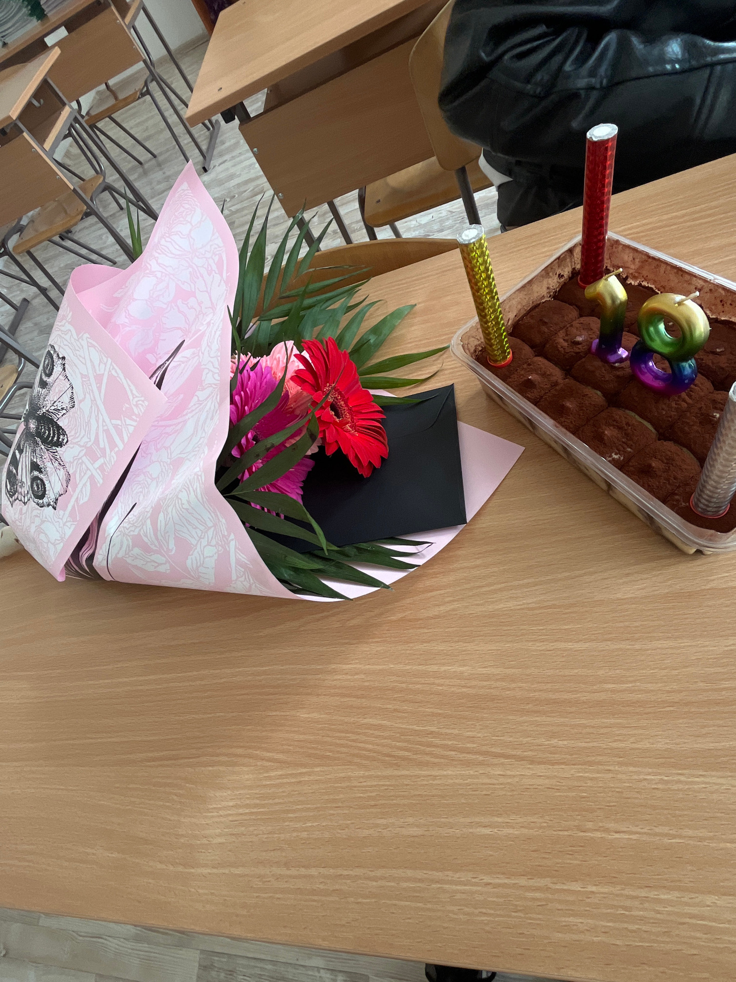 The image depicts a celebration scene on a wooden surface, possibly a desk, situated indoors. To the top left is a rectangular plastic container holding a tiramisu-style dessert with several colorful…read more