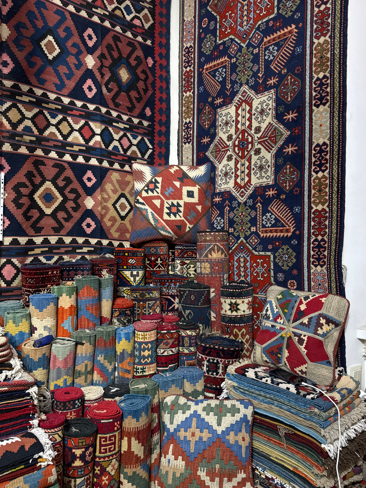 The image shows a collection of rugs and cushions with intricate geometric patterns. A large rug with a dark blue background and geometric designs including star shapes and angular borders occupies thβ¦read more